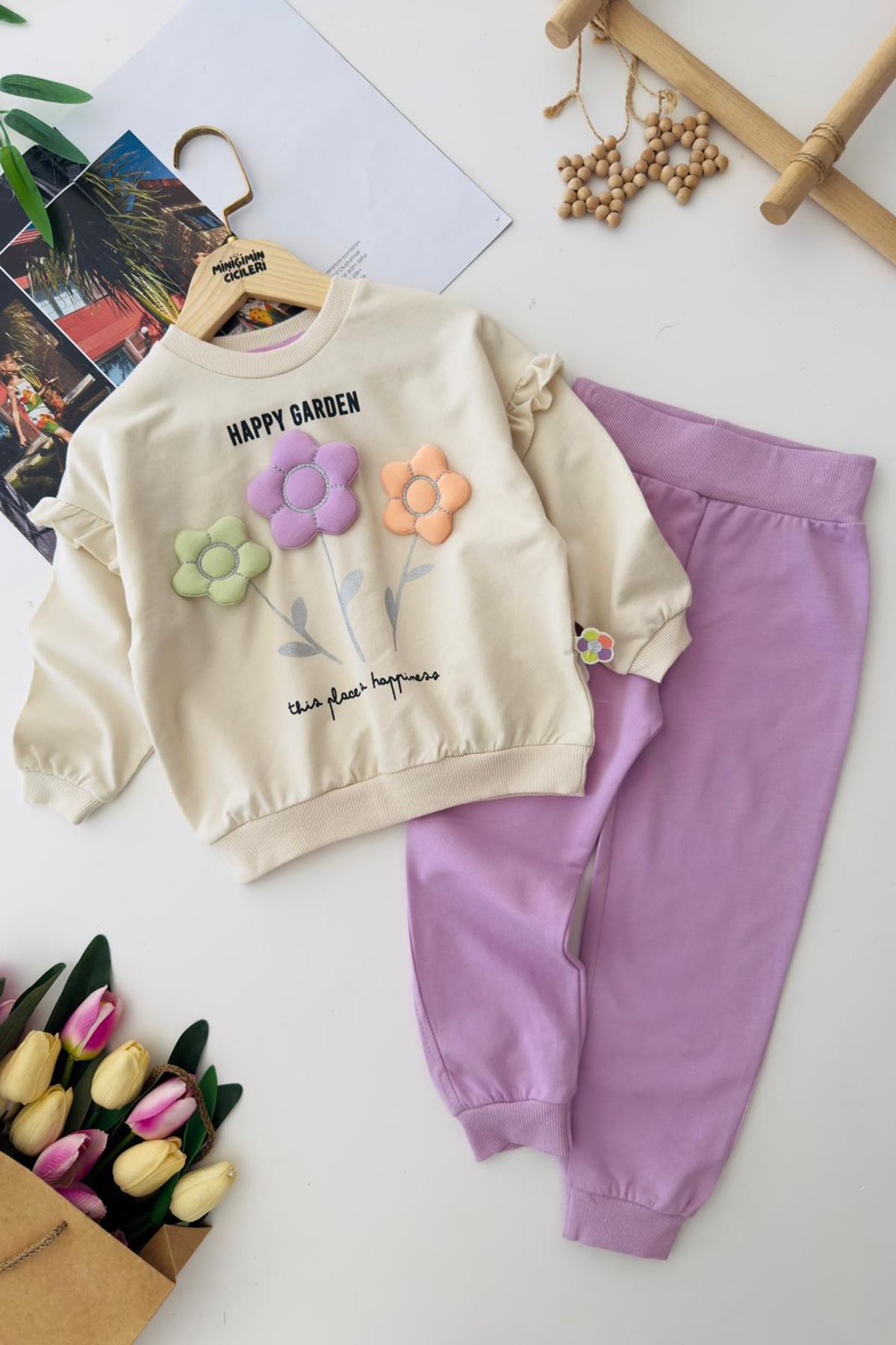 Mimiğimin Cicileri Renkli Papatya Desenli Kız Çocuk Pamuklu Penye Takım - Lila