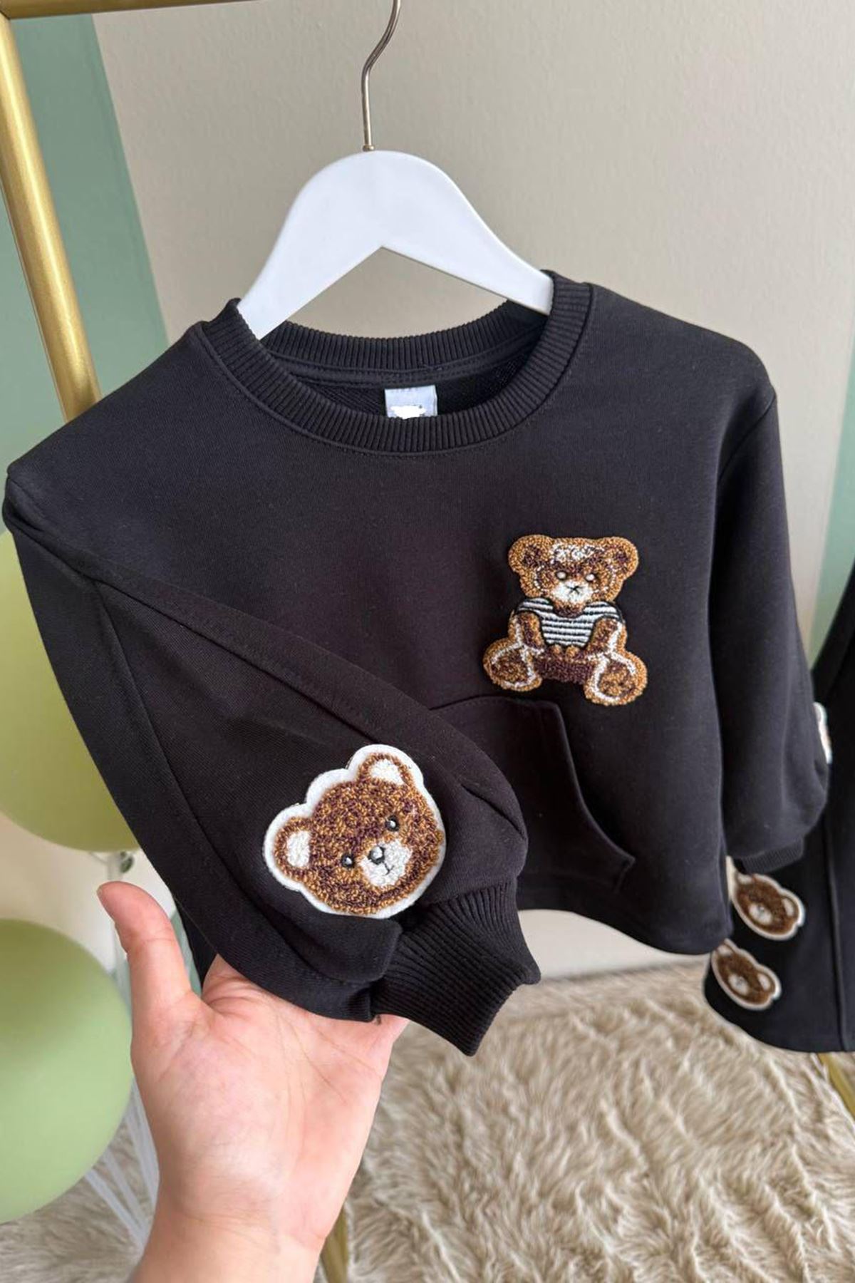 • 🧸 Ayıcık panç detaylı sweat: Göğüs ve kol kısımlarında bulunan kadife dokulu ayıcık aplikeleriyle dikkat çeker. Kanguru cebi ile şıklık ve işlevsellik bir arada sunulur.