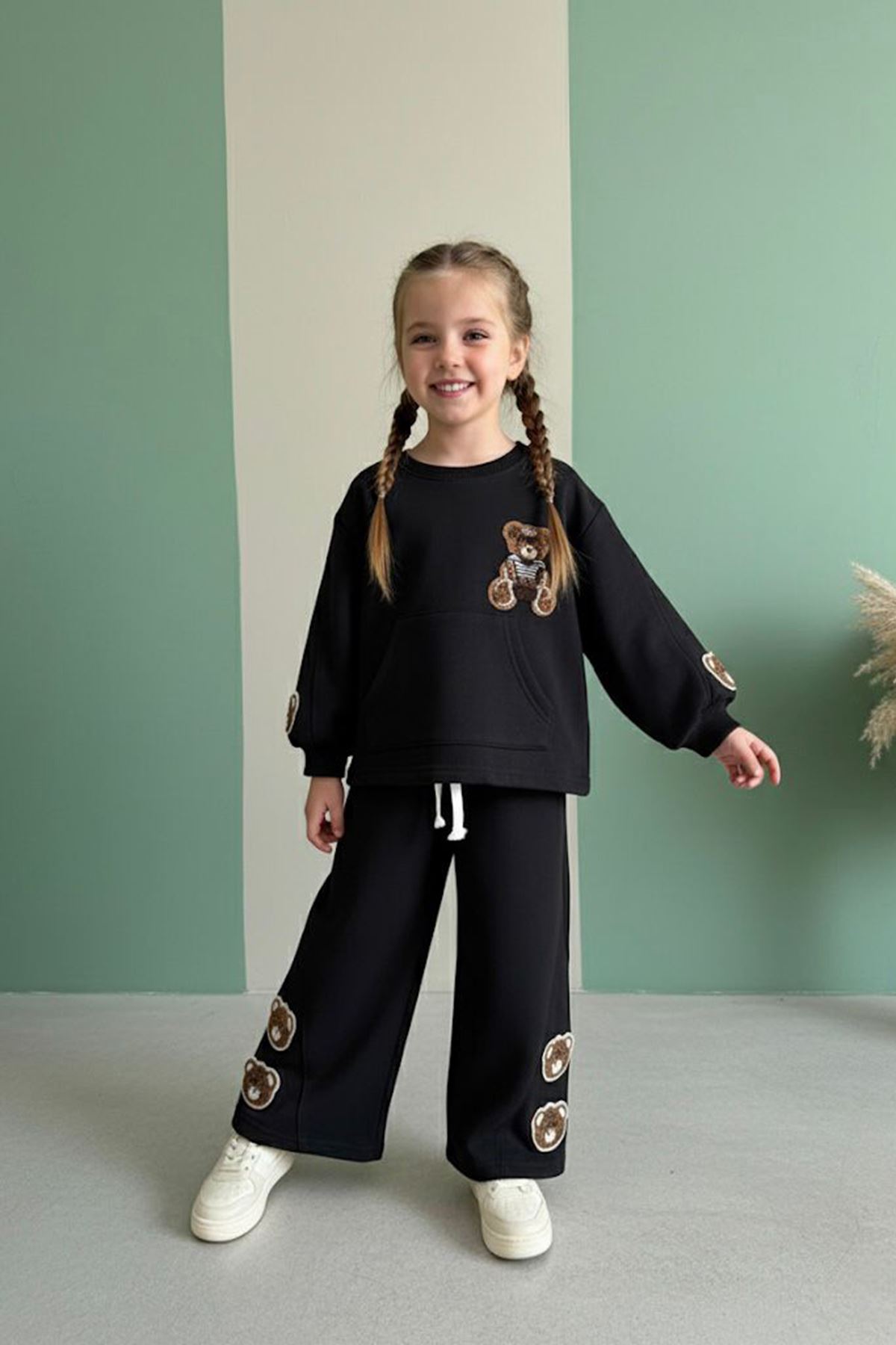 Sevimli ayıcık detaylarıyla süslenmiş bu rahat kız çocuk takımı, hem konforlu kesimiyle hem de zarif duruşuyla öne çıkıyor.