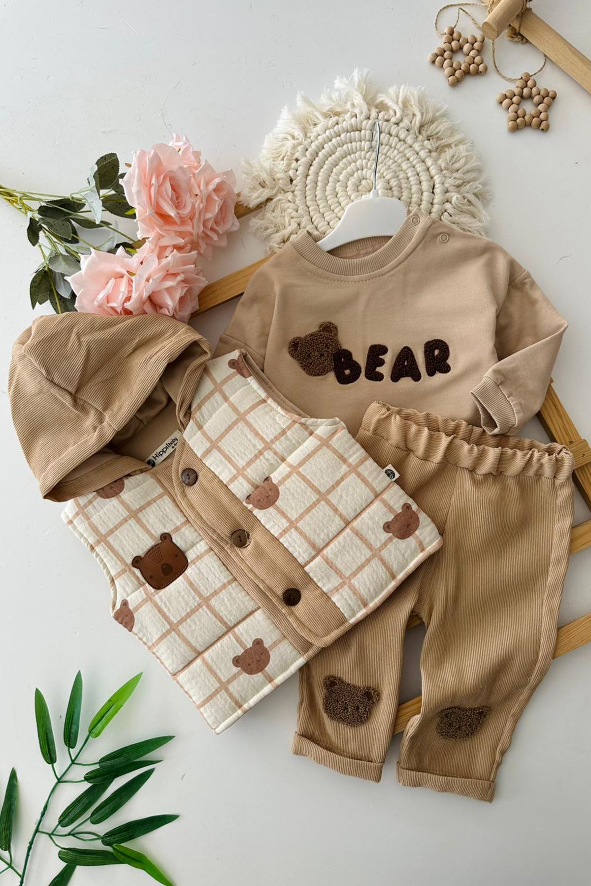 ✨ Ürün Özellikleri: 🧥 Ayı desenli şişme yelek, düğmeli tasarımı ve kapüşonuyla şirin bir görünüm sunar. 👕 Uzun kollu sweatshirt, ön kısmındaki "BEAR" panç detaylı baskısıyla takımı tamamlar. 👖 Esnek bel ve diz kısmında ayı figürleri bulunan pantolon, konfor ve hareket özgürlüğü sağlar. 🌿 Yumuşak ve cilt dostu kumaş yapısı, bebeğinizin hassas cildine uygundur. ✔️ Üçlü kombin parçaları ayrı ayrı da kullanılabilir, farklı kombinlerde şık bir tamamlayıcı olur.