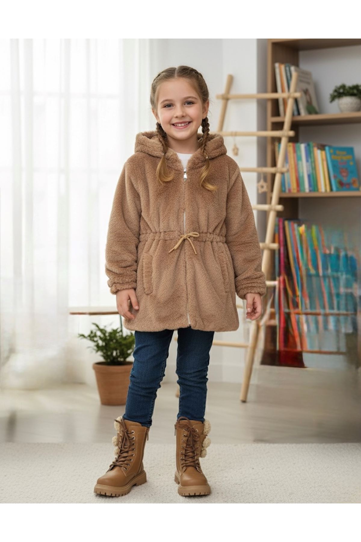 Miniğimin Cicileri Belden Bağcık Detaylı Kapüşonlu Peluş Kız Çocuk Mont - Vizon