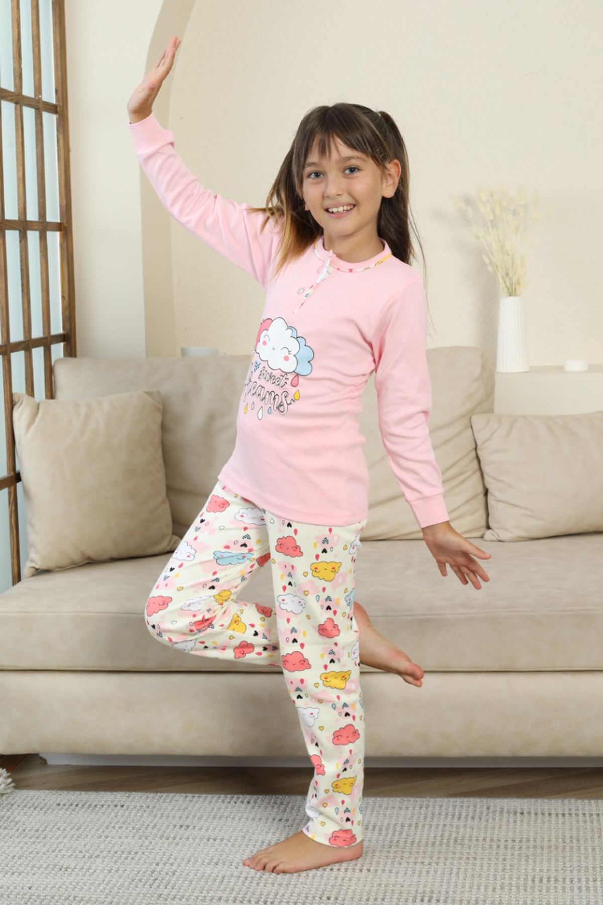 ☁️ Bulut Baskılı Düğmeli Kız Çocuk Pijama Takımı