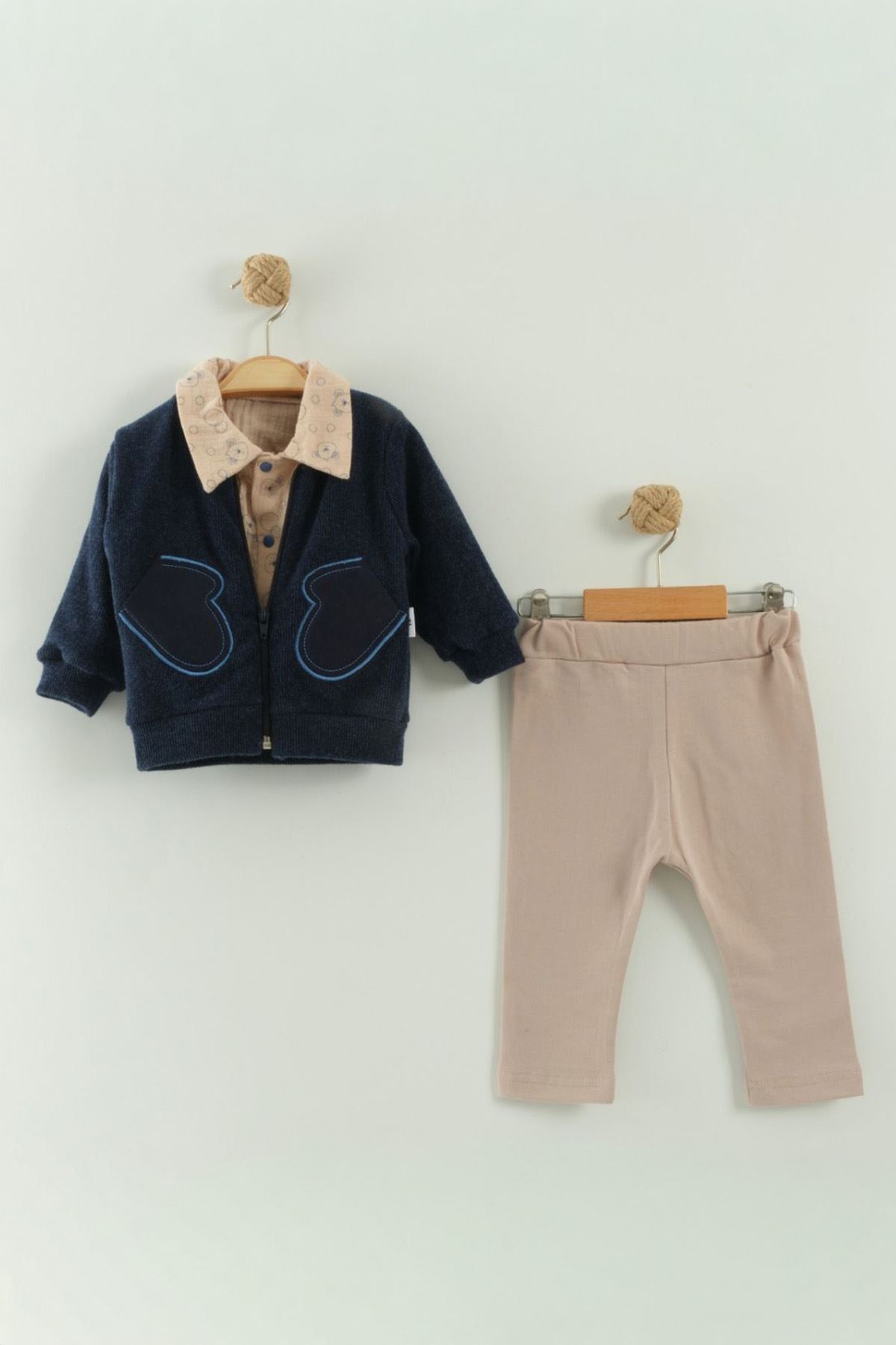 Minik beylerin şıklığına şıklık katacak sevimli bir kombin! 🐾 Bu 3’lü takım, hem konforlu hem de tarz detaylarıyla öne çıkıyor. 💙