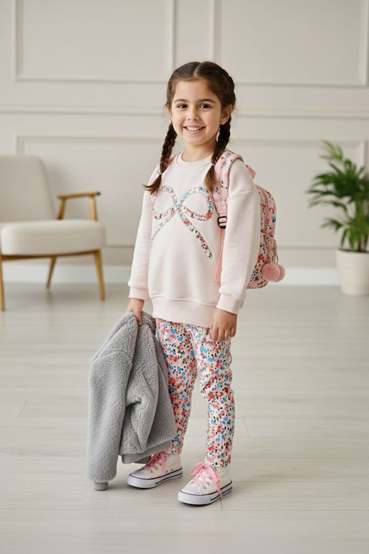 🌟 Ürün Özellikleri: 👕 Üst kısmında çiçek baskılı büyük fiyonk detayı ile sevimli bir tasarım. 👖 Desenli taytı ile enerjik ve modern bir görünüm. 🧵 Yumuşacık 3 ip şardonsuz kumaş sayesinde gün boyu rahat kullanım. 👌 Günlük kombinlerde ve özel günlerde tercih edilebilecek zarif bir takım.