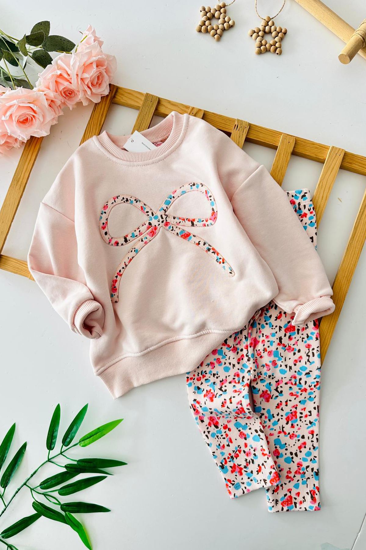 🌸 Miniğimin Cicileri Çiçek Baskılı Fiyonk Detaylı Kız Çocuk Taytlı Takım