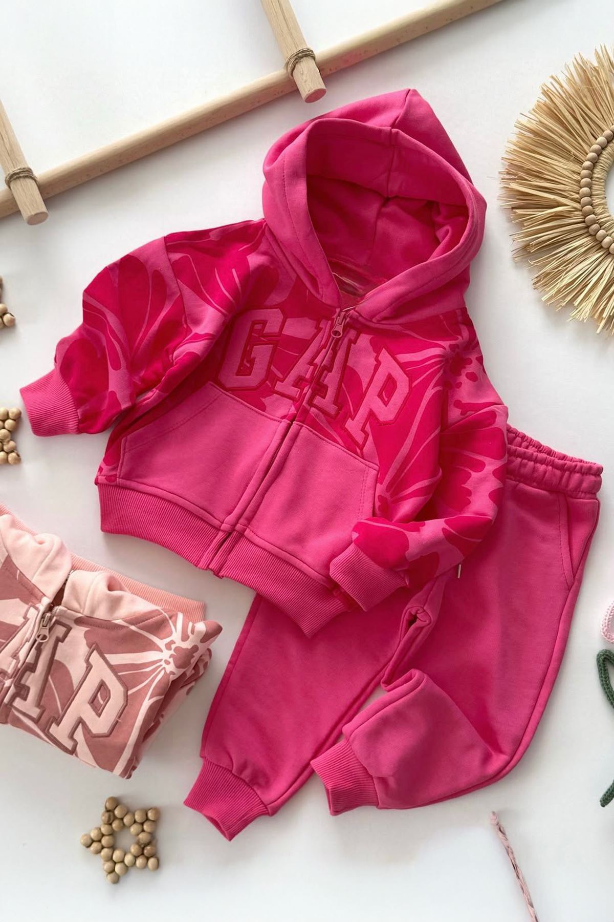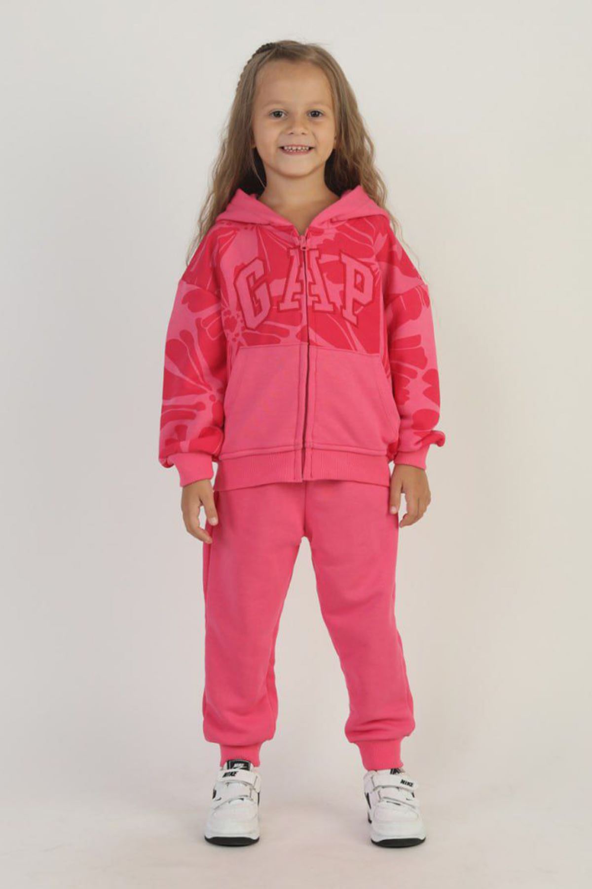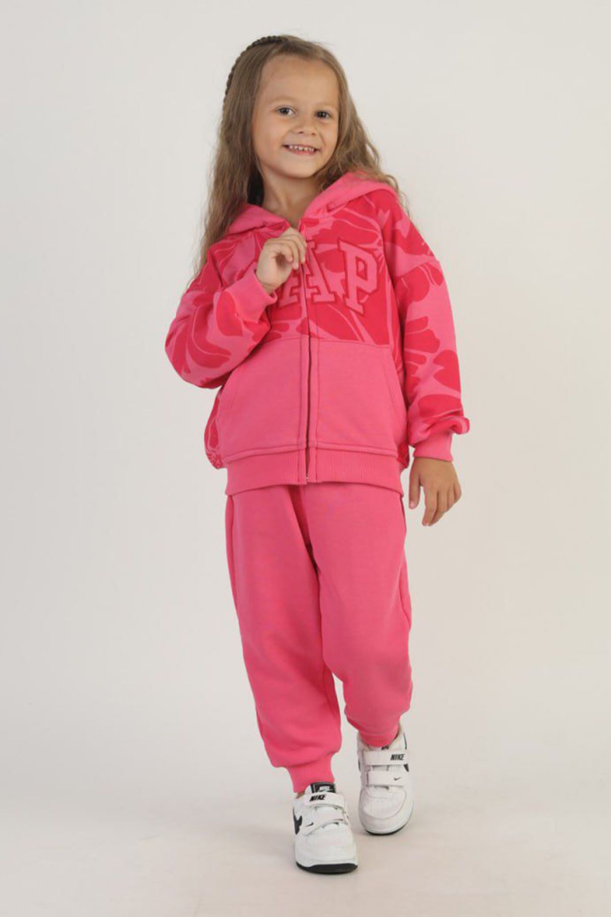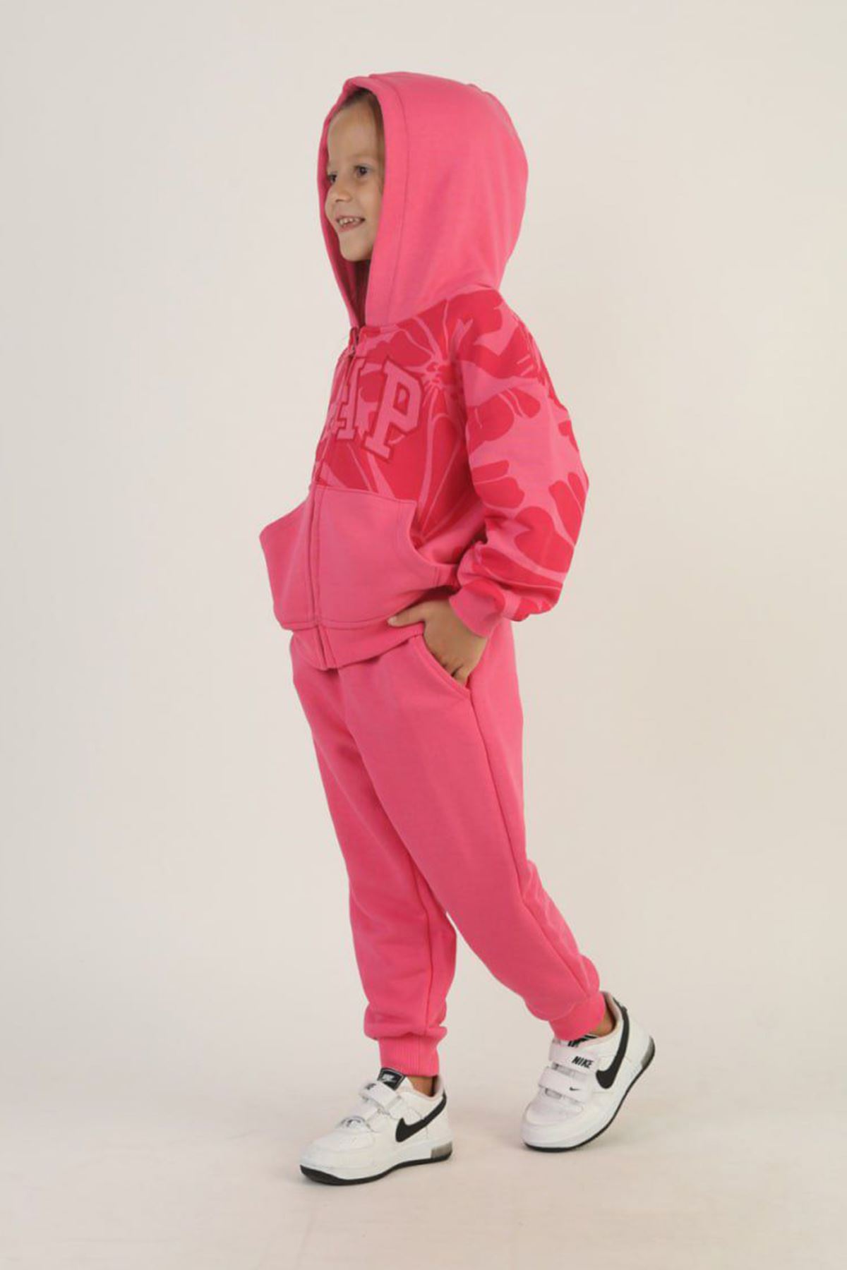 Miniğimin Cicileri Çiçek Desenli Kapüşonlu 2’li Eşofman Takımı - Fuşya