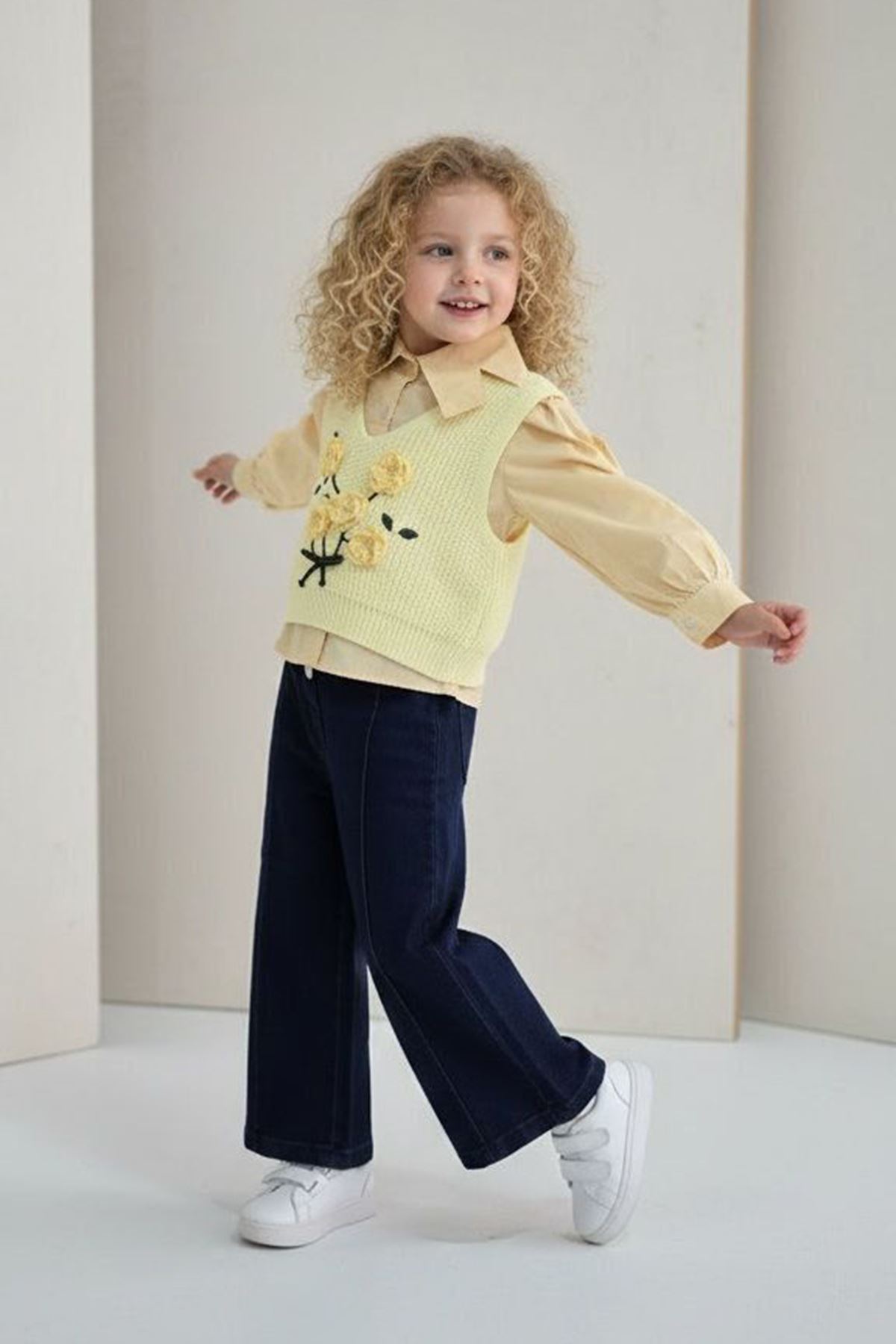 🌼 Miniğimin Cicileri Çiçek Detaylı Örgü Süveterli 3’lü Kız Çocuk Takım