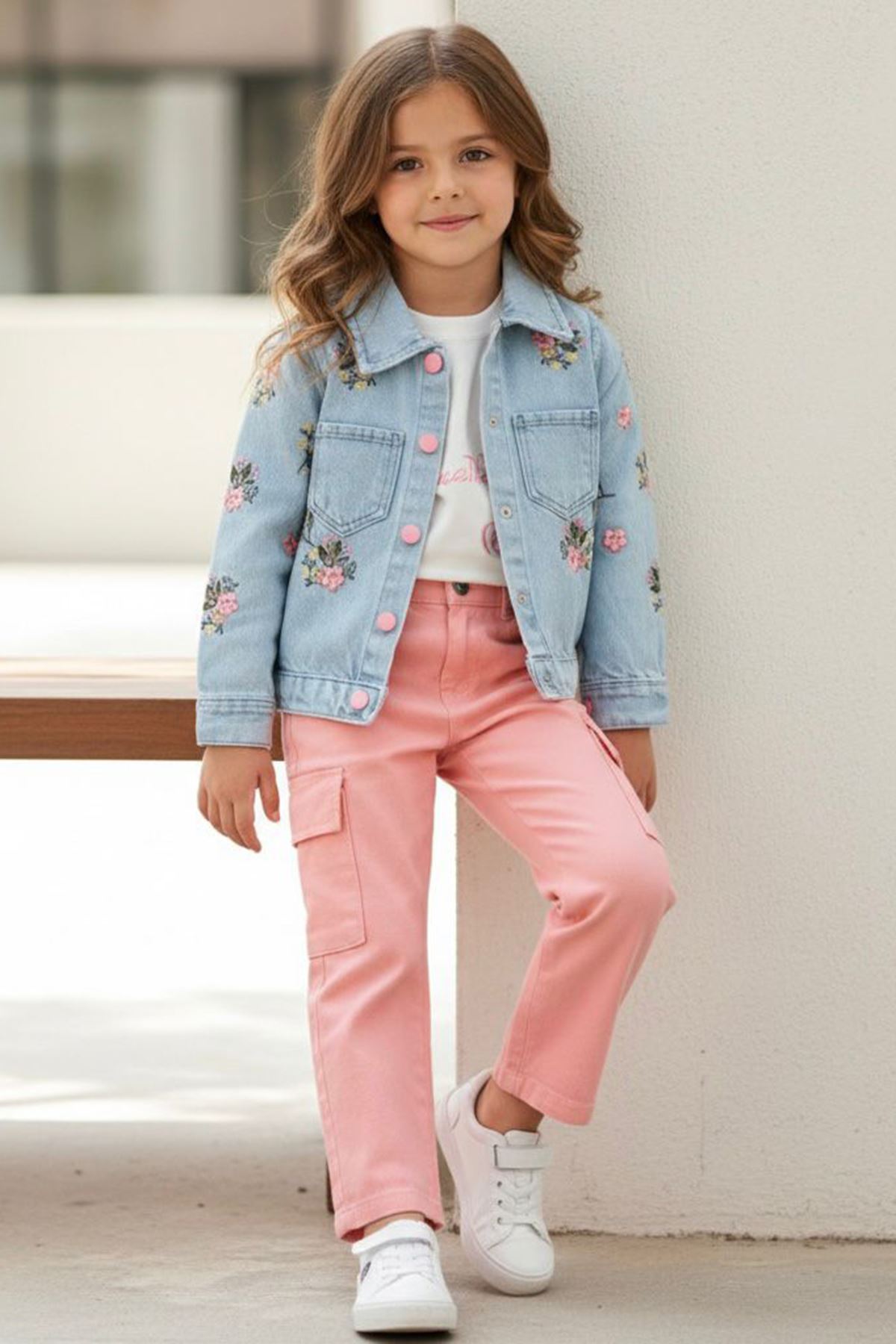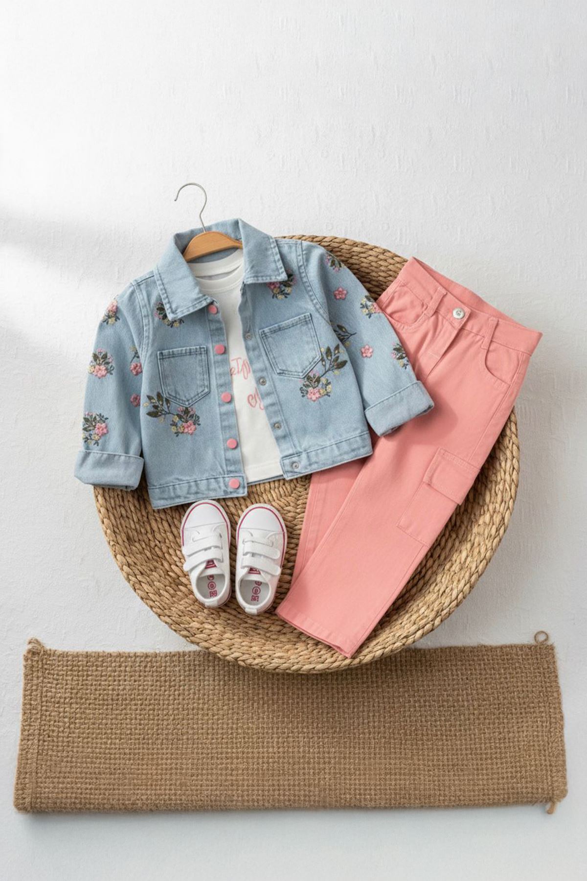 👗 Ürün İçeriği: 🧥 Çiçek işlemeli kot ceket 👕 Baskılı tişört 👖 Kargo cepli pantolon