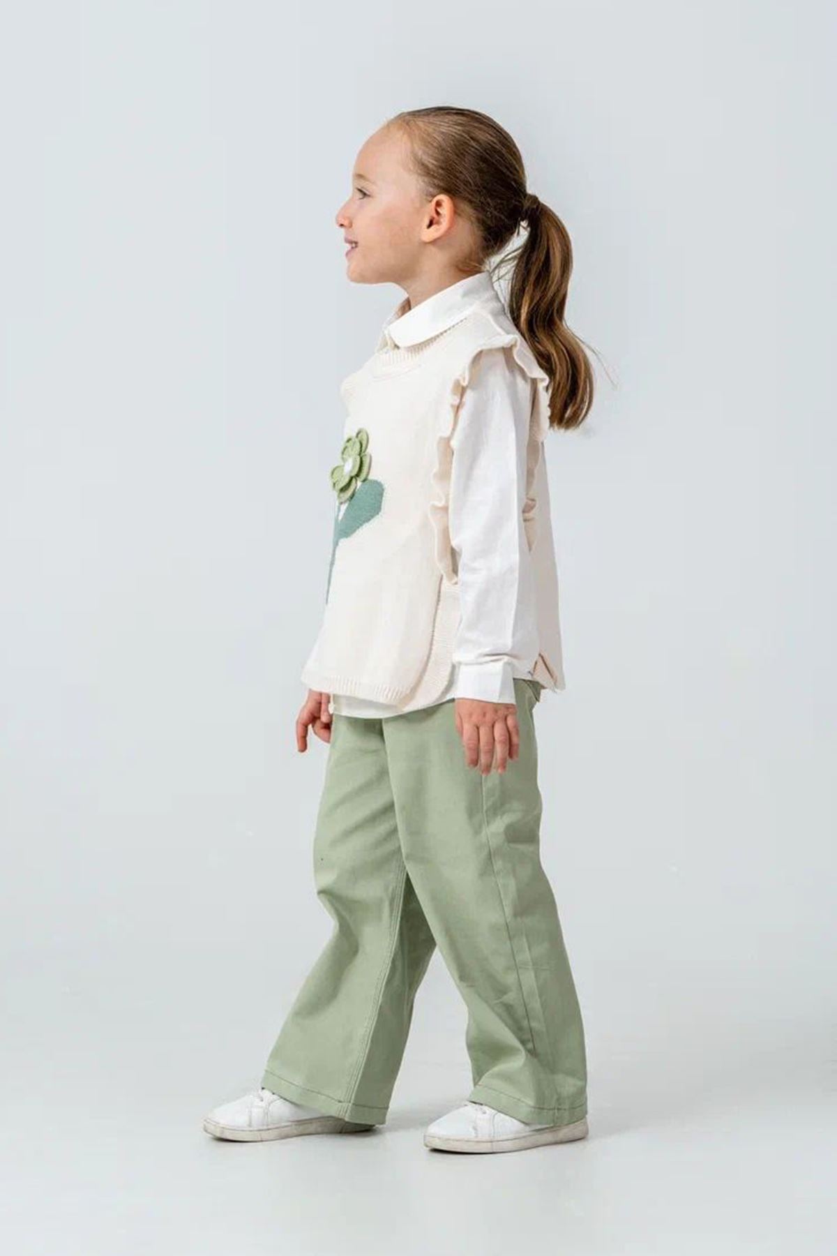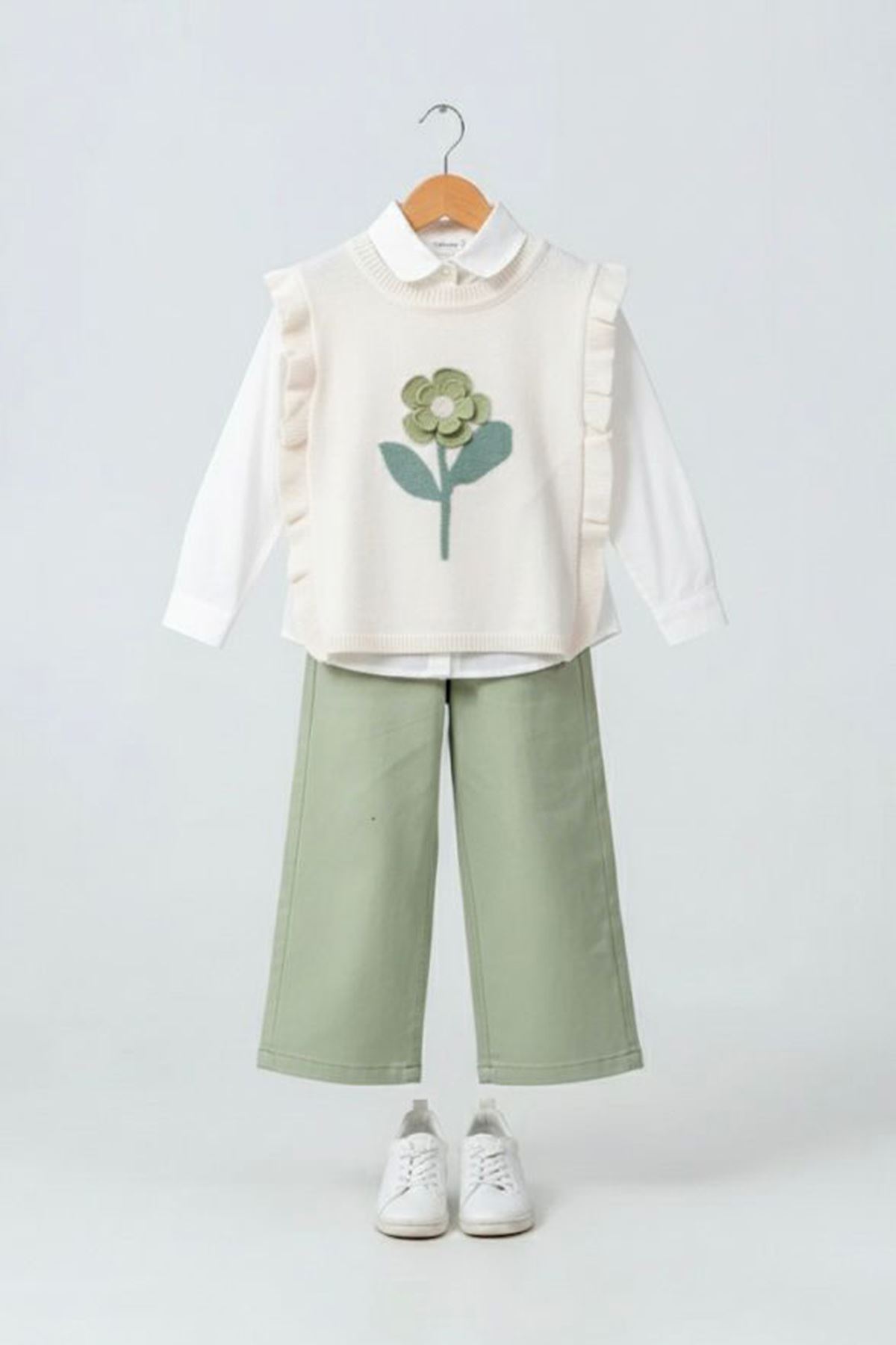 Miniğimin Cicileri Çiçek Motifli Triko Süveterli Pantolonlu Kız Çocuk 3 lü Kombin - Yeşil