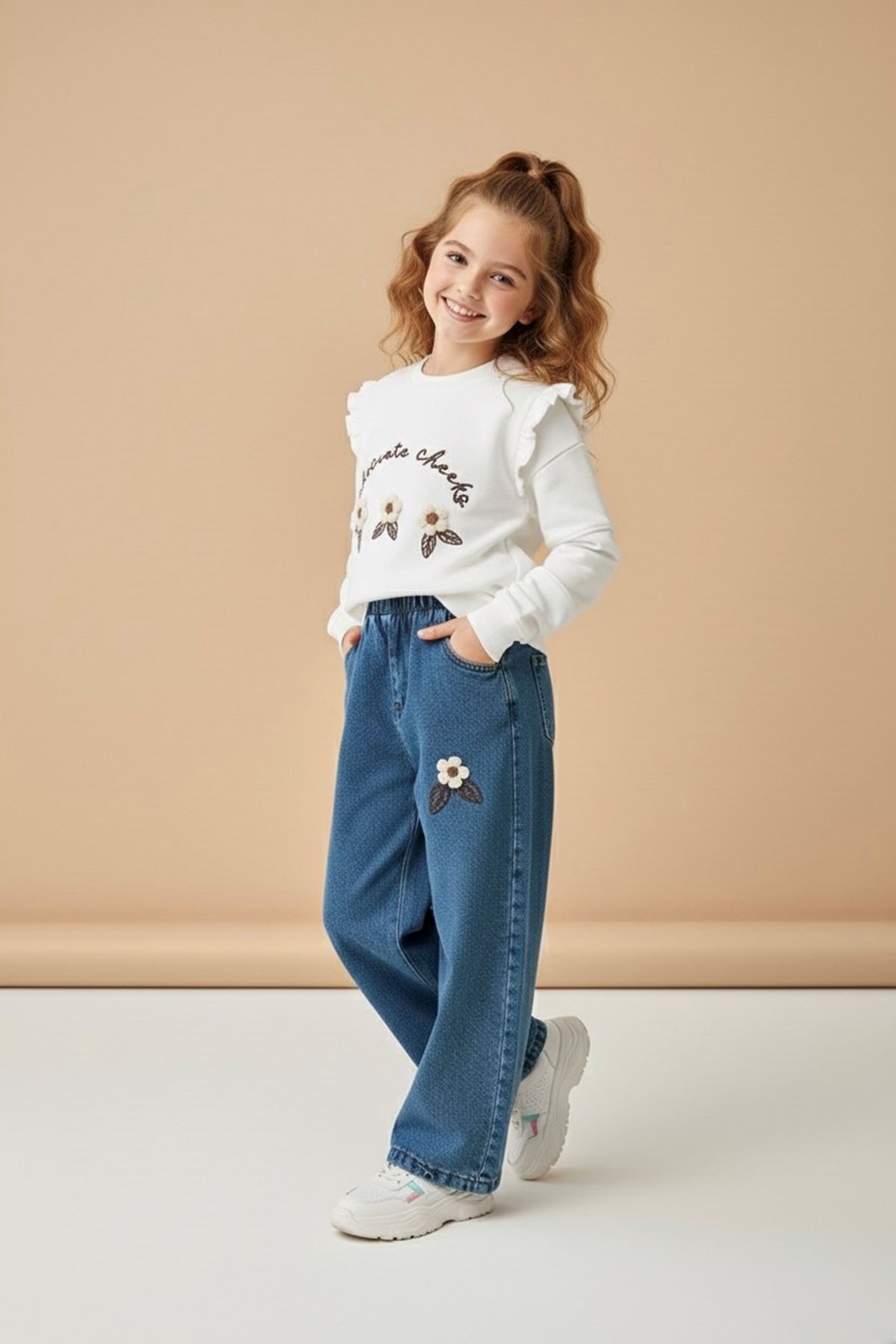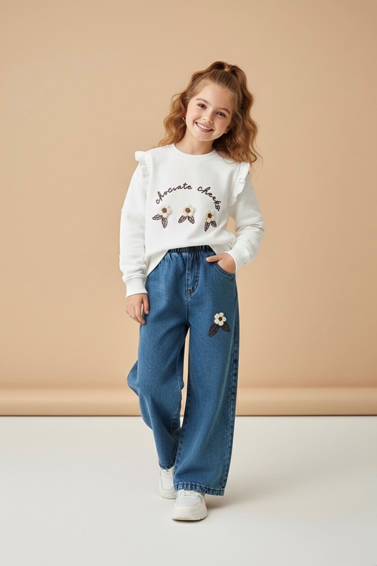 ✨ Ürün Özellikleri: 👕 Üst: Fırfırlı kol detaylarıyla hareketlendirilmiş yumuşak kumaştan sweatshirt. Ön yüzünde 3D çiçek aplikeleri ve nakış işlemeleri yer alır. 👖 Alt: Rahat kesimli bol paça kot pantolon, üzerinde çiçek nakış detaylarıyla tamamlanmış. 🧵 Esnek bel yapısı sayesinde kolay giyilip çıkarılır, minikler için maksimum konfor sağlar.