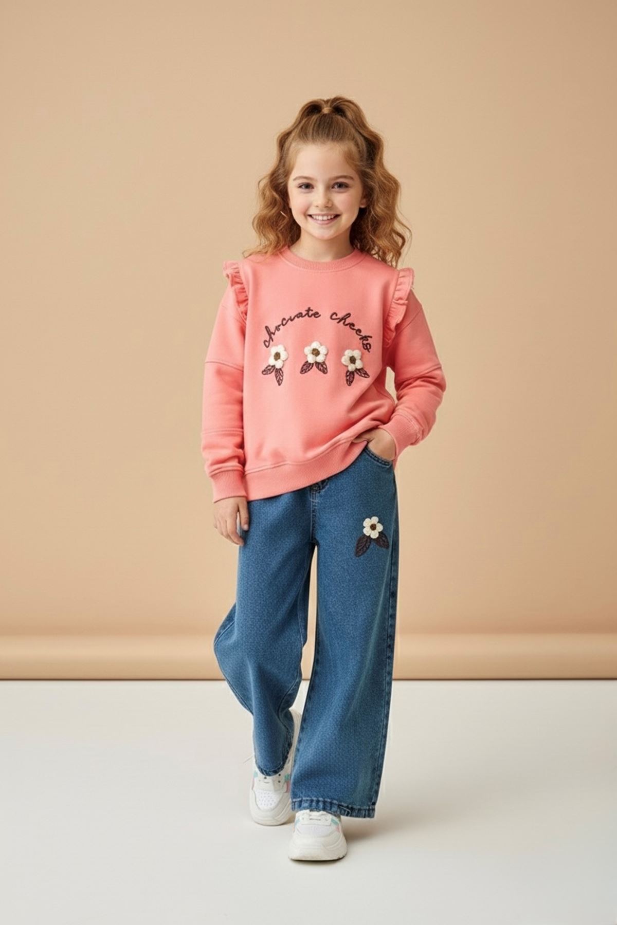 👕 Üst: Fırfırlı kol detaylarıyla hareketlendirilmiş yumuşak kumaştan sweatshirt. Ön yüzünde 3D çiçek aplikeleri ve nakış işlemeleri yer alır.