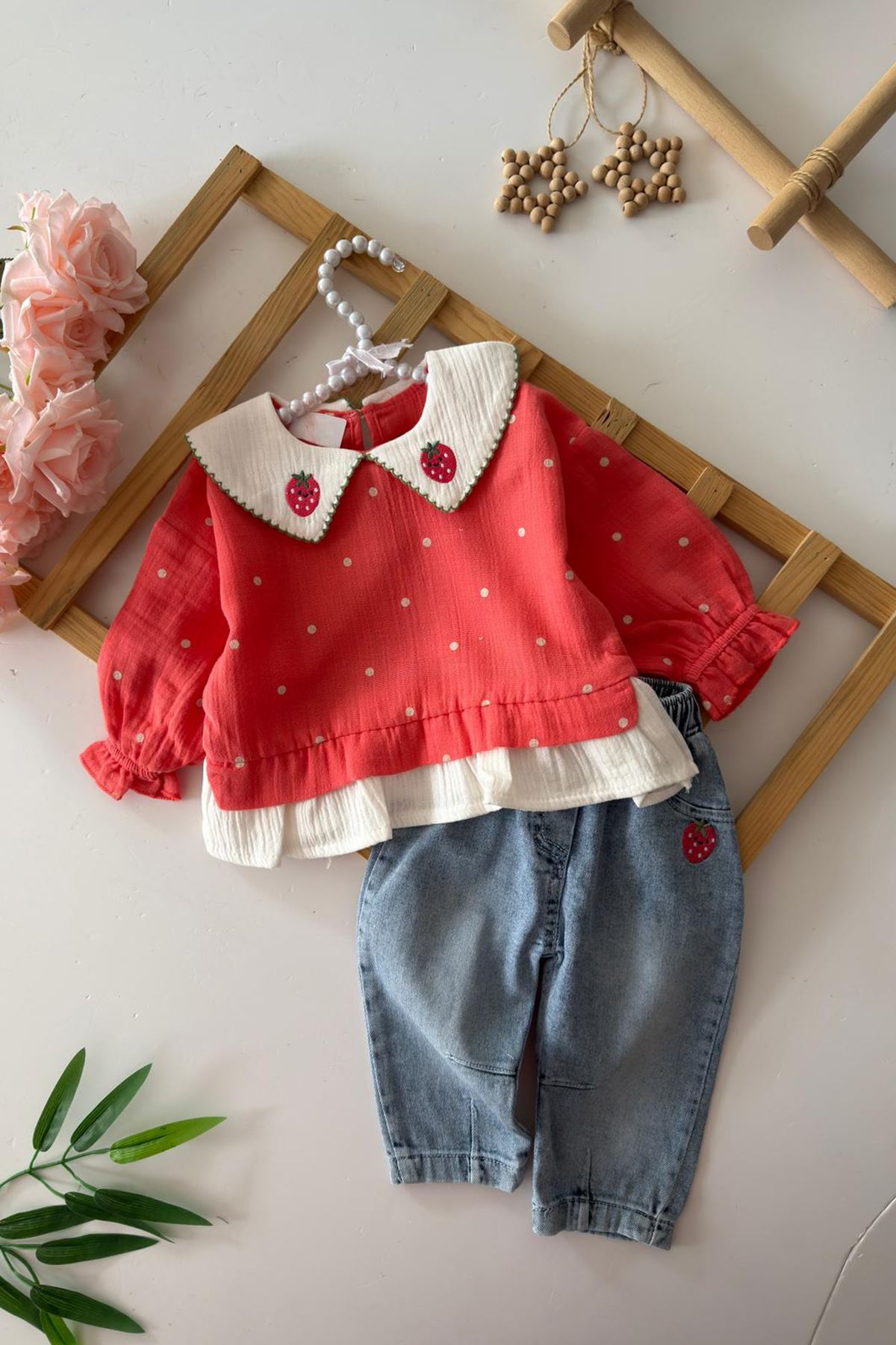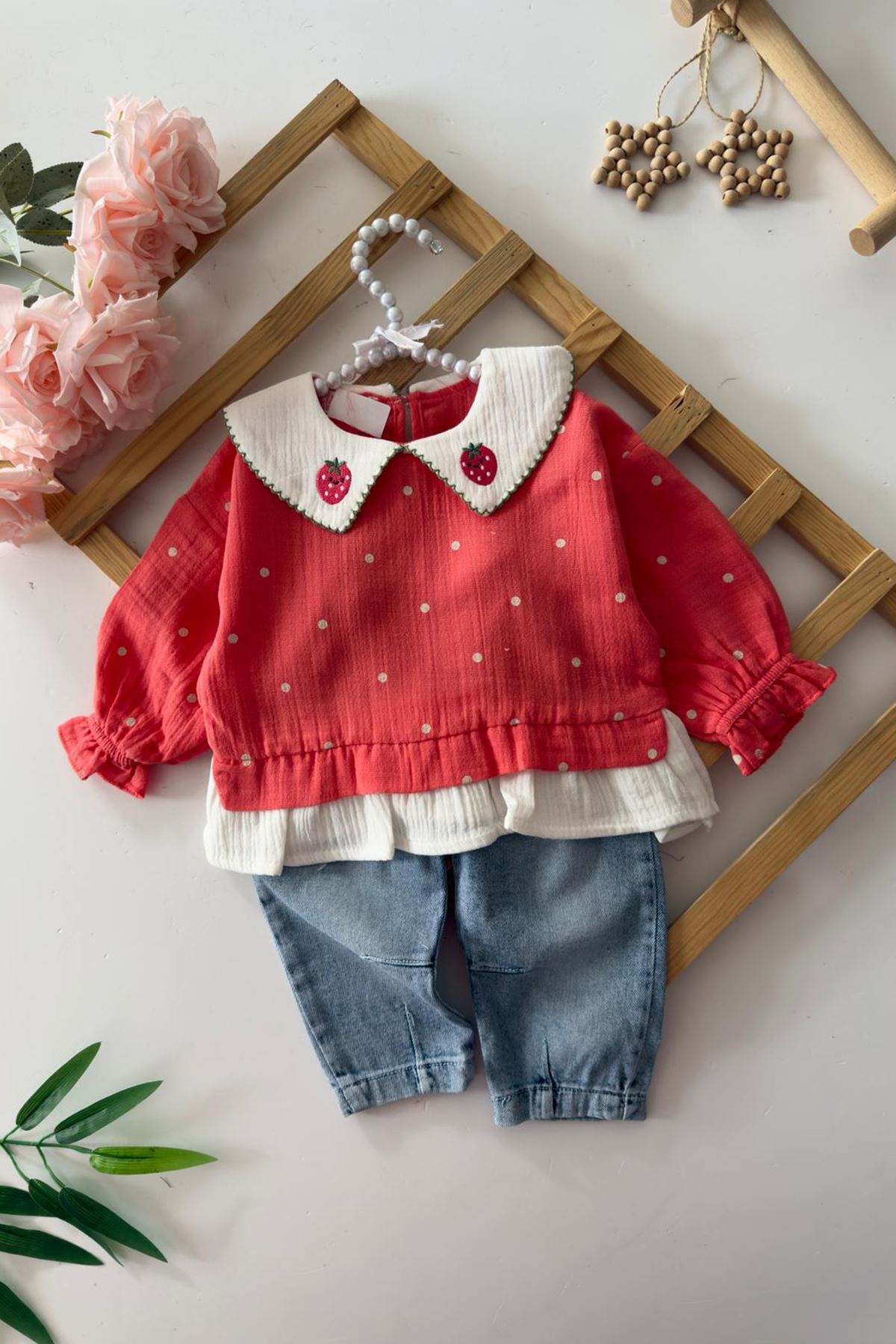 ✨ Ürün Özellikleri: 👕 Müslin üst parça, hafif ve nefes alabilen yapısıyla bebeğinizin cildine dosttur. 🍓 Yaka kısmındaki çilek işlemeleri ve puantiyeli desen, takıma şirin bir hava katar. 🎀 Kat kat görünüm sağlayan tasarım, hem spor hem şık bir stil oluşturur. 👖 Kot pantolon, esnek beliyle rahat giyilir ve hareket kolaylığı sağlar. 🌟 Pantolon üzerindeki çilek nakış detayı, üstle uyumlu bütünlük sağlar.