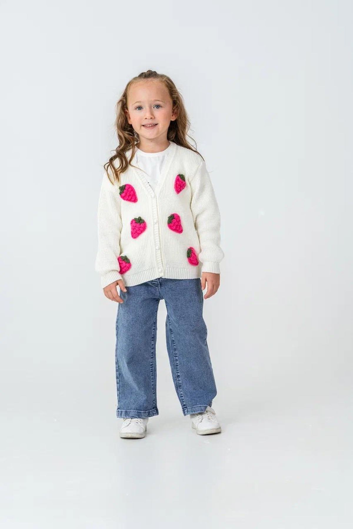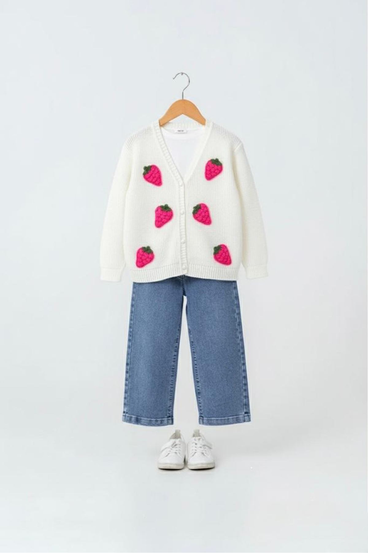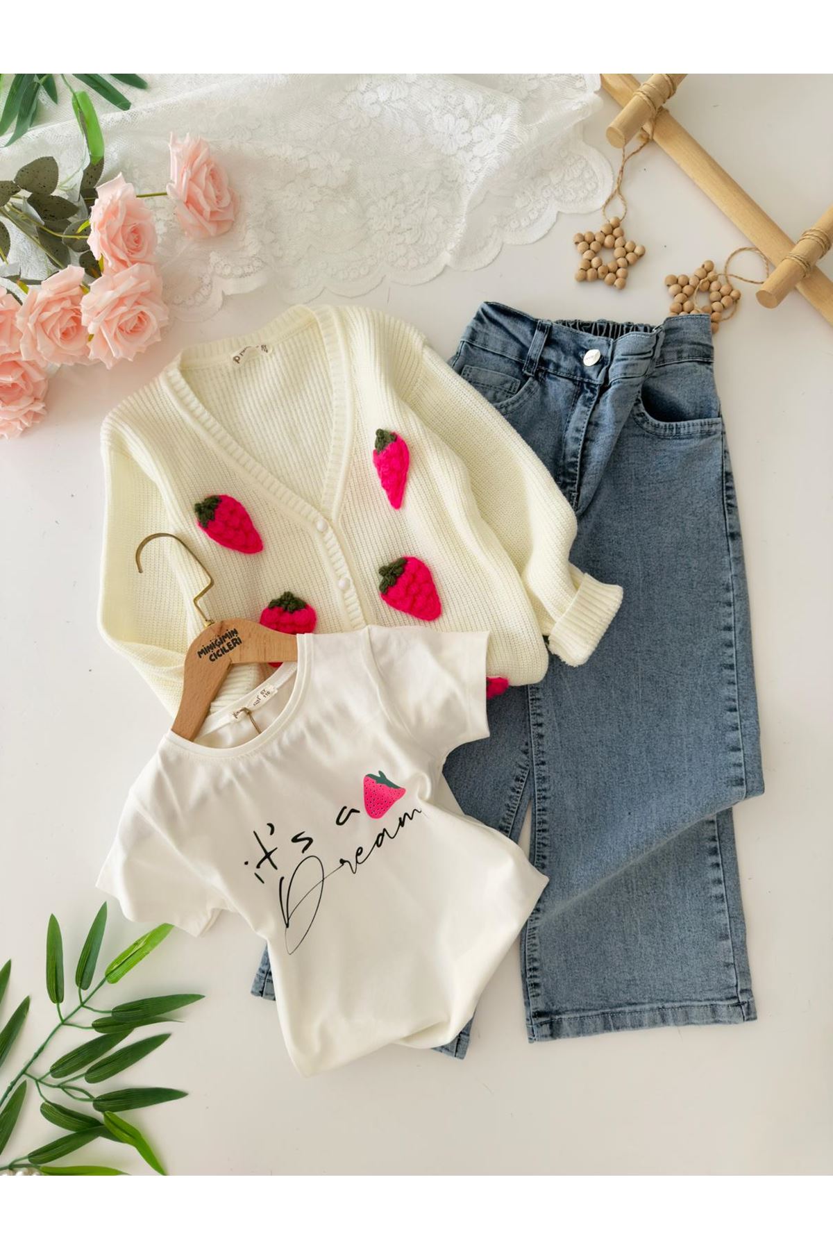 🔖 Miniğimin Cicileri Çilek Triko İşleme Detaylı Hırkalı Kız Çocuk 3’lü Takım