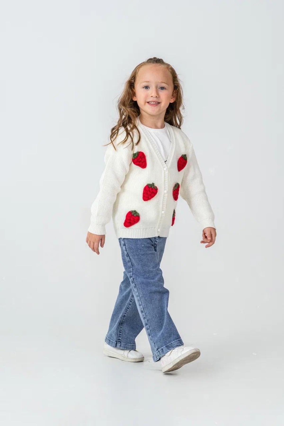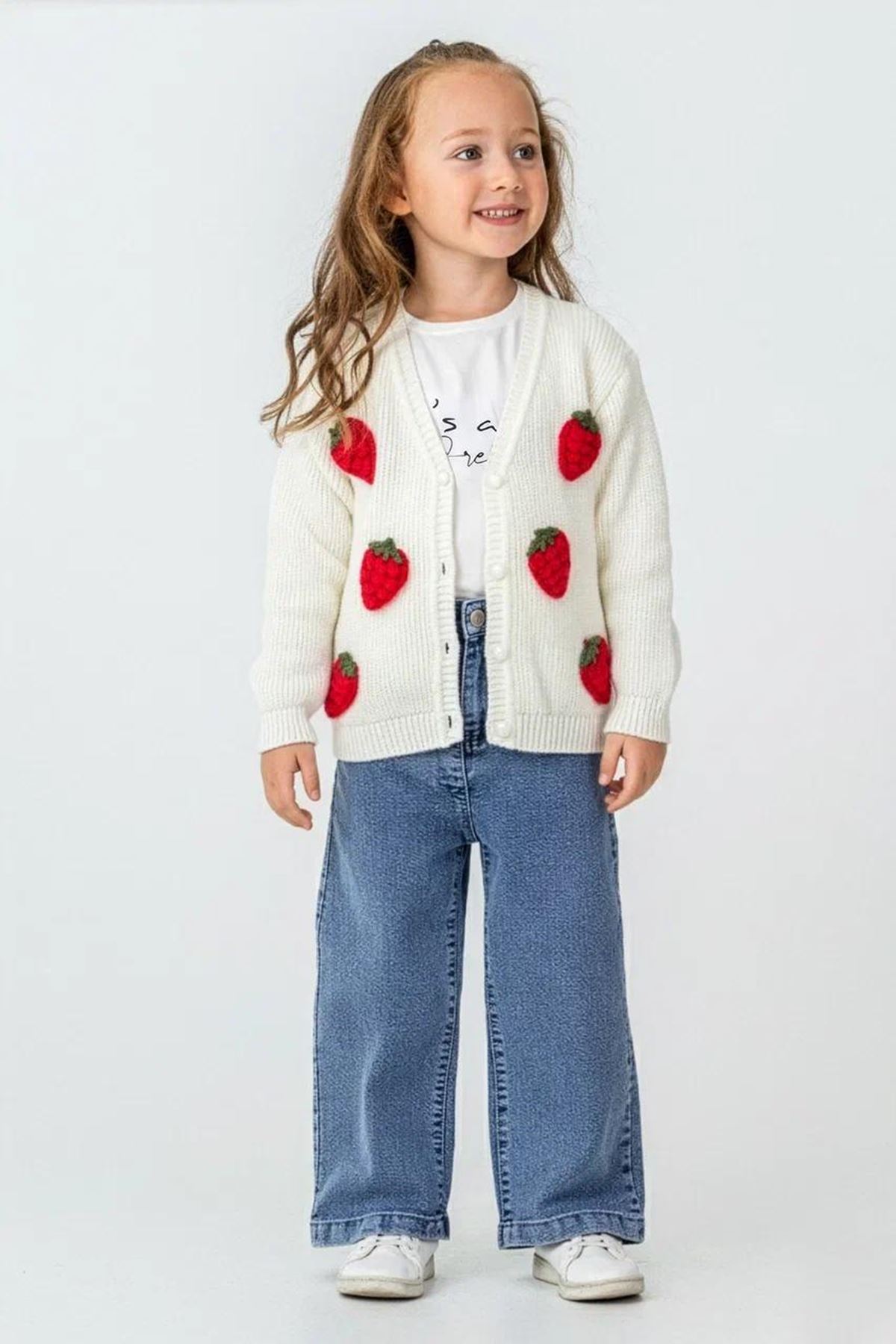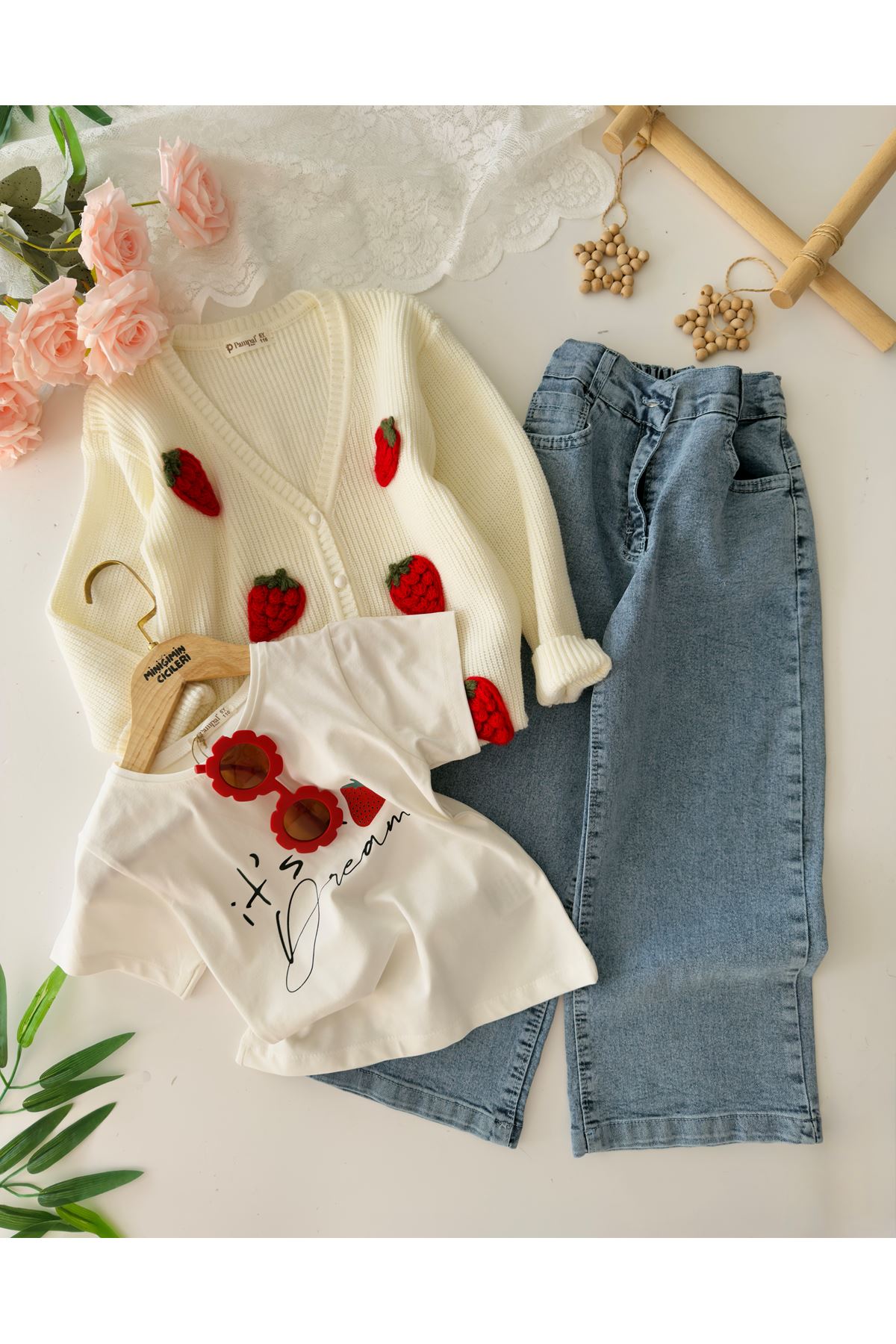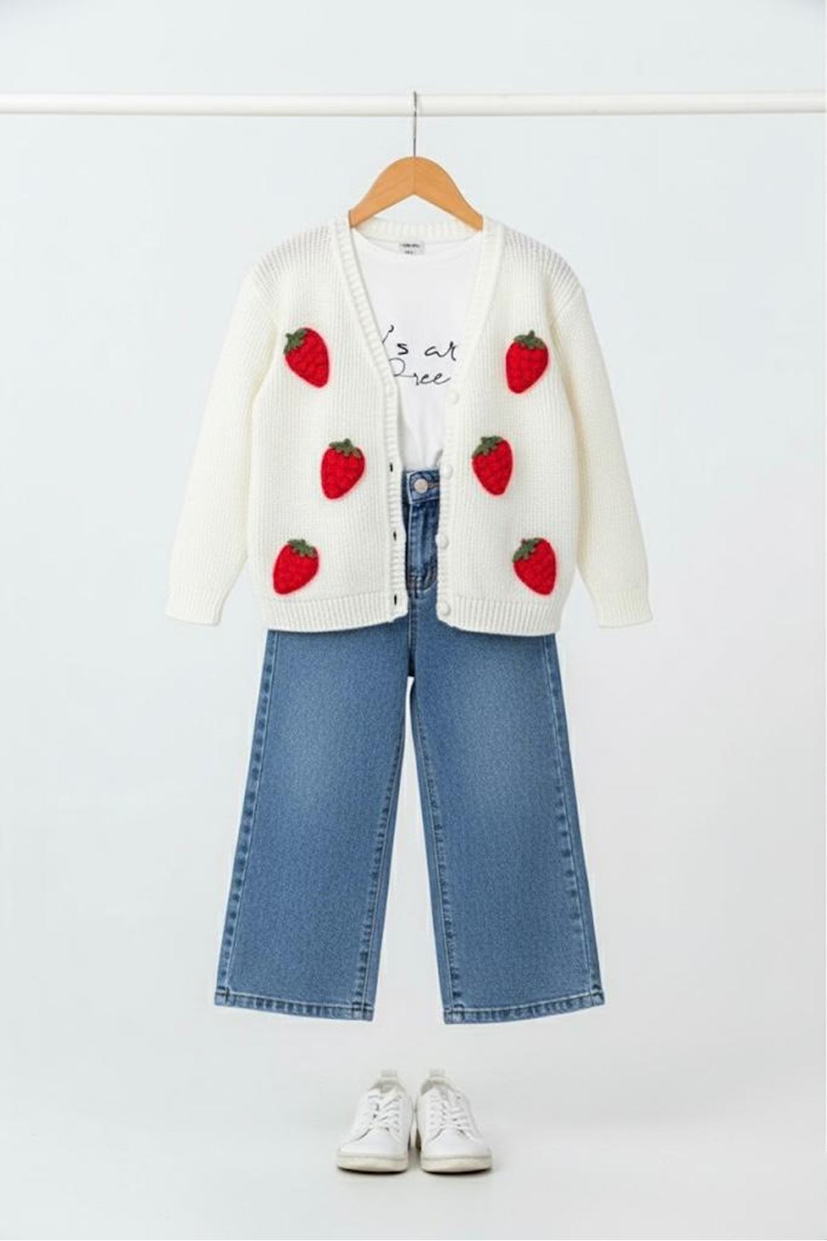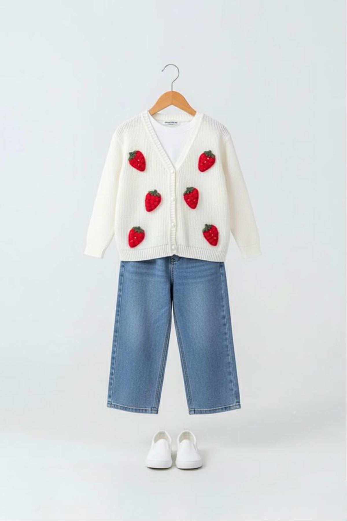 • 🧥 Hırka: Üzerindeki kabartmalı çilek motifleriyle hareketli bir görünüm sunar. Triko dokusu sayesinde hem sıcak tutar hem de esneklik sağlar.