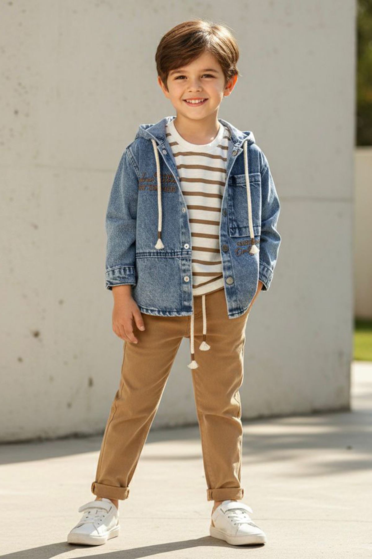 Küçük beylerin enerjik tarzına modern bir dokunuş! Bu şık üçlü takım, çizgili detayları ve kot ceket stiliyle hem günlük kullanımda hem de özel günlerde rahatlıkla tercih edilebilir. 👕👖