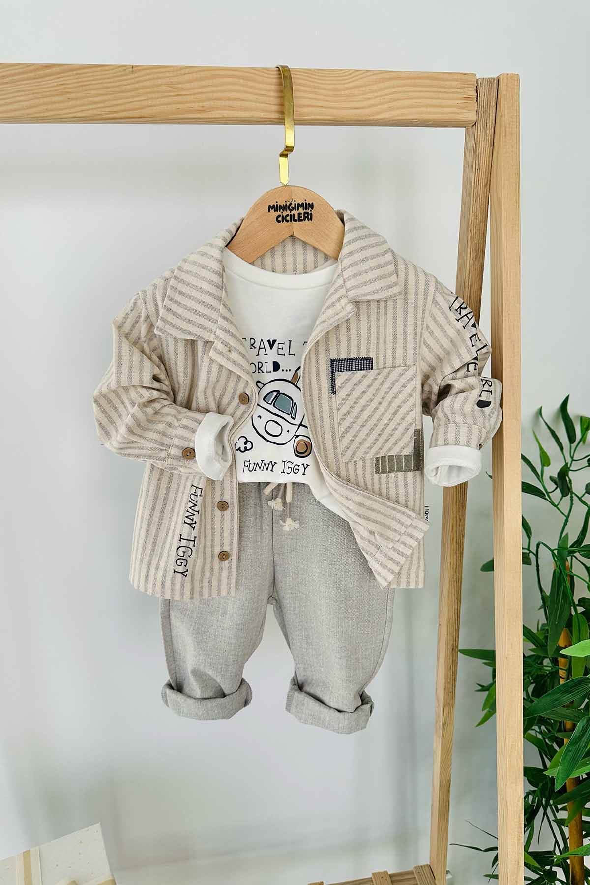 Miniğimin Cicileri Çizgili Keten Pamuklu 3 Parça Erkek Bebek Takım
