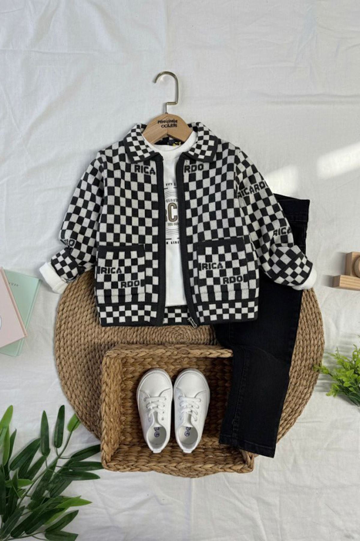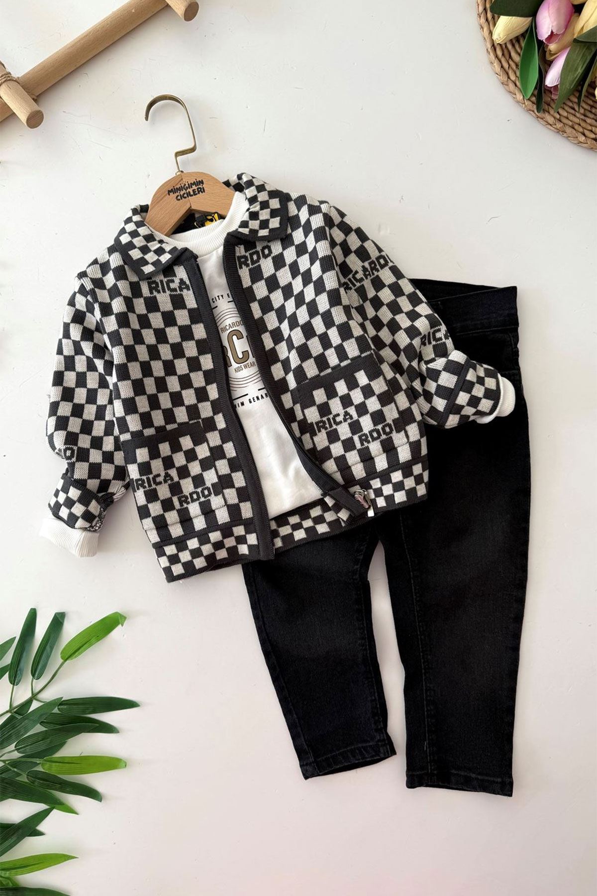 🖤 Damalı Triko Hırkalı Erkek Çocuk 3’lü Takım