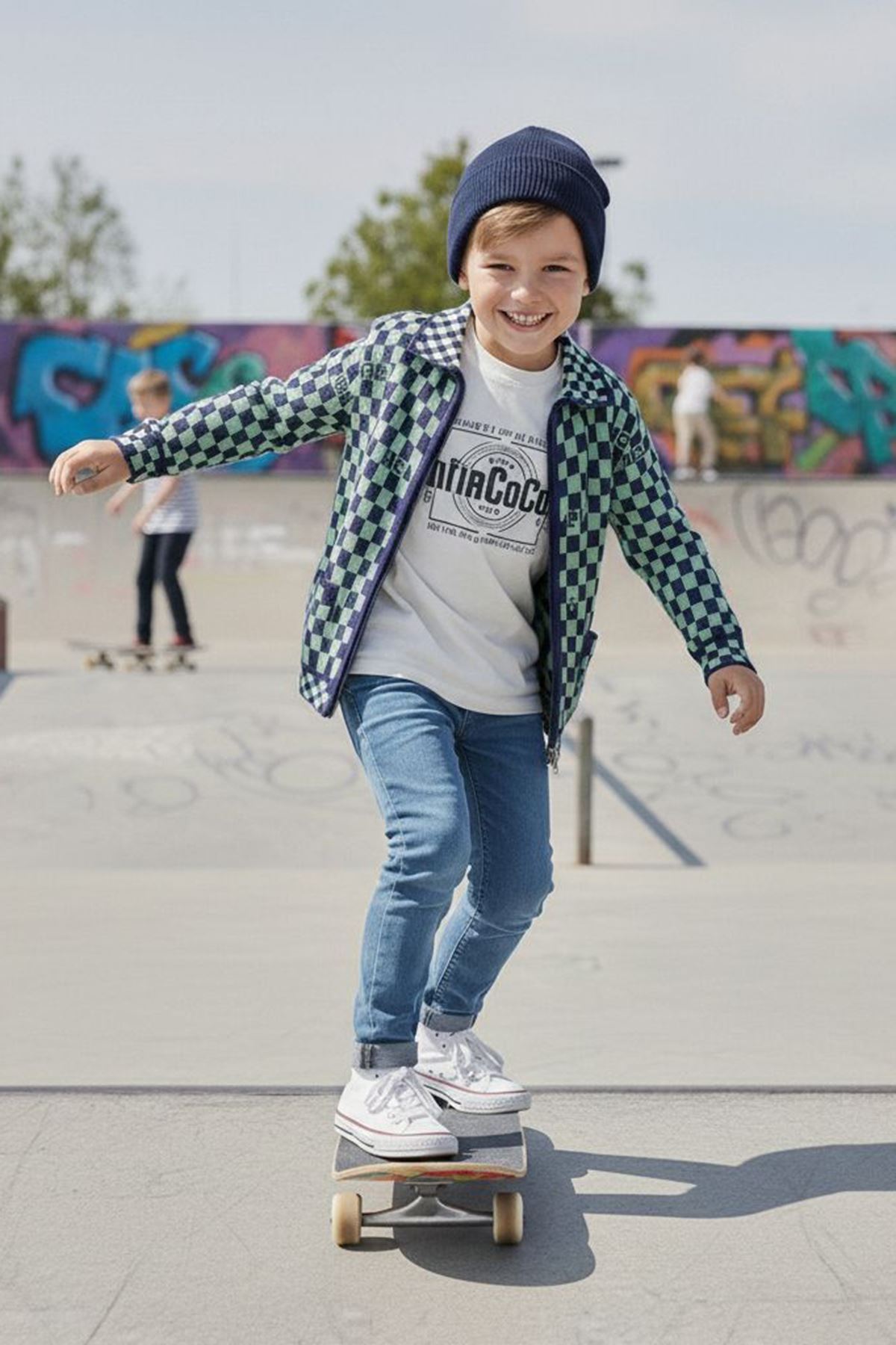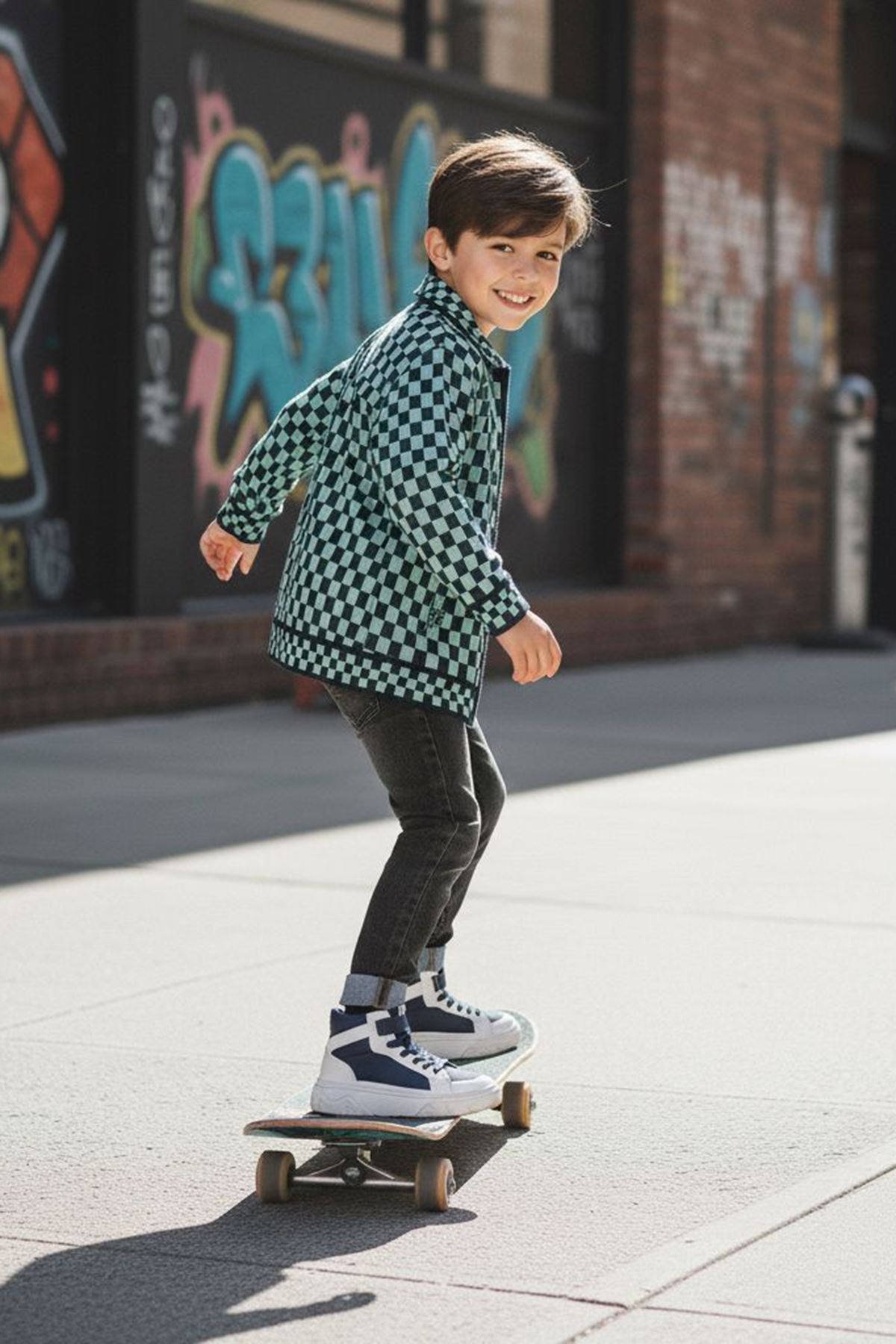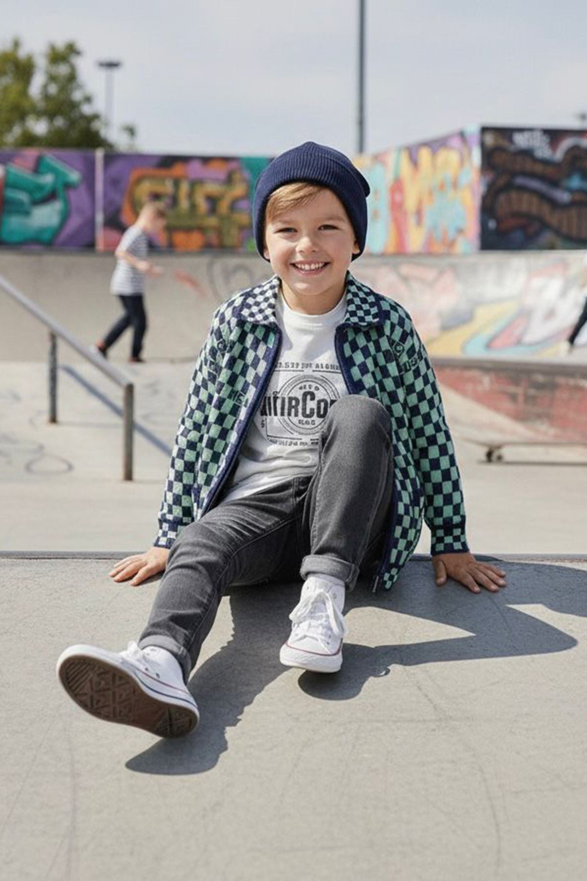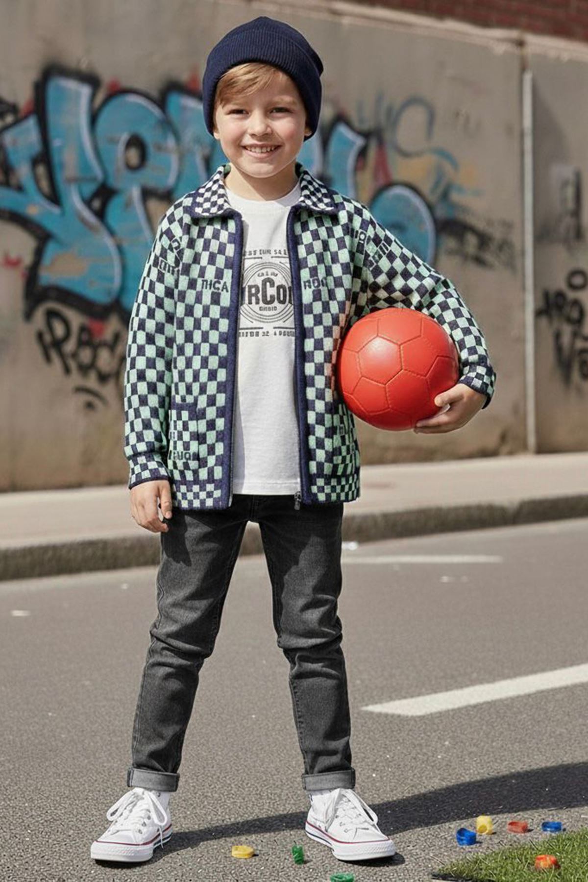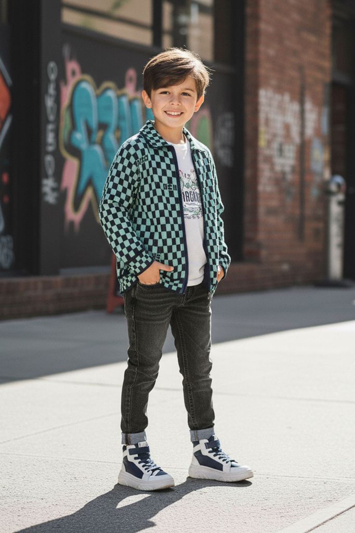 Küçük beylerin enerjik tarzını yansıtan harika bir kombin! Şehir modasından ilham alınarak tasarlanan bu takım, damalı triko hırkasıyla hem spor hem cool bir görünüm sunuyor. 🛹✨
