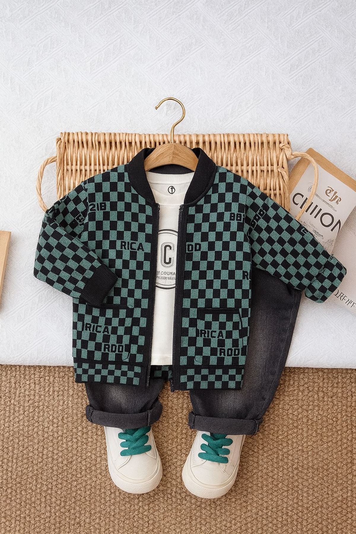🖤 Damalı Triko Hırkalı Erkek Çocuk 3’lü Takım