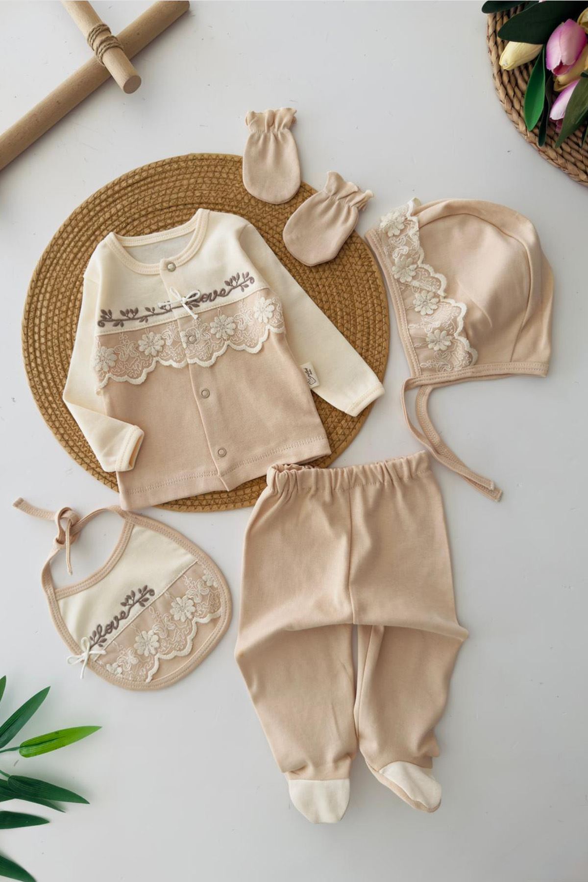 Miniğimin Cicileri Dantel Çiçek Detaylı 5’li Organik Kız Bebek Hastane Çıkış Seti - Bej