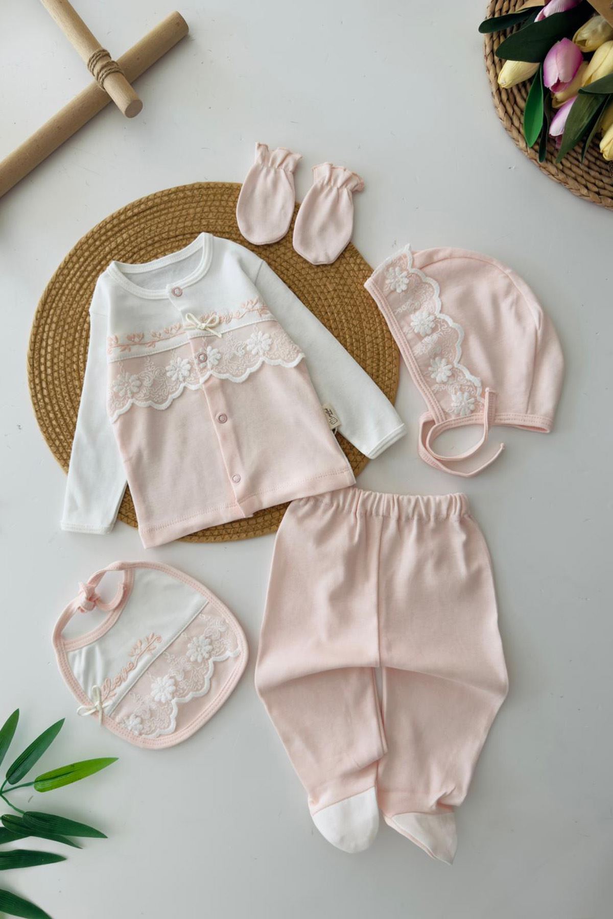 🌸 Miniğimin Cicileri Dantel Çiçek Detaylı 5’li Organik Kız Bebek Hastane Çıkış Seti