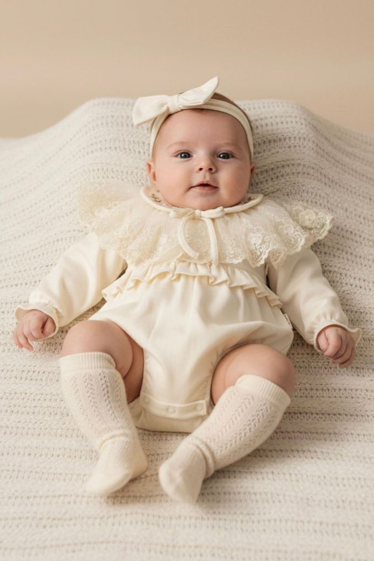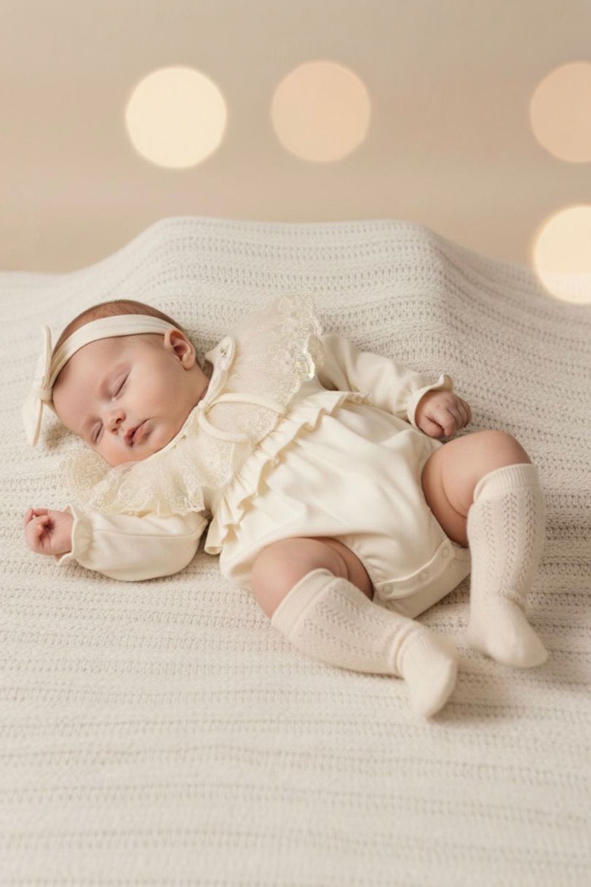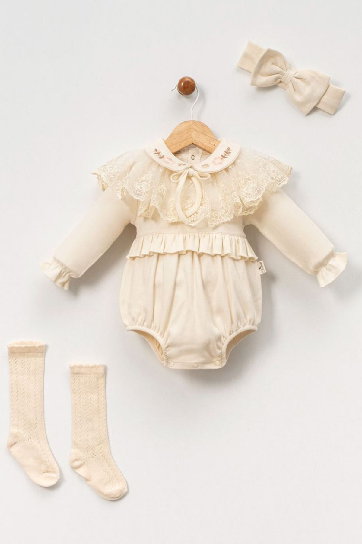 🌿 %100 pamuk kumaştan üretilmiştir, bebeğinizin hassas cildine zarar vermez. 🎀 El işçiliği işlemeler ve dantel detaylar zarif bir görünüm sunar. 👗 Yumuşak, esnek ve nefes alan yapısıyla konforlu bir kullanım sağlar. 💫 Hastane çıkışı, özel günler veya hediye alternatifi olarak mükemmel bir seçimdir.