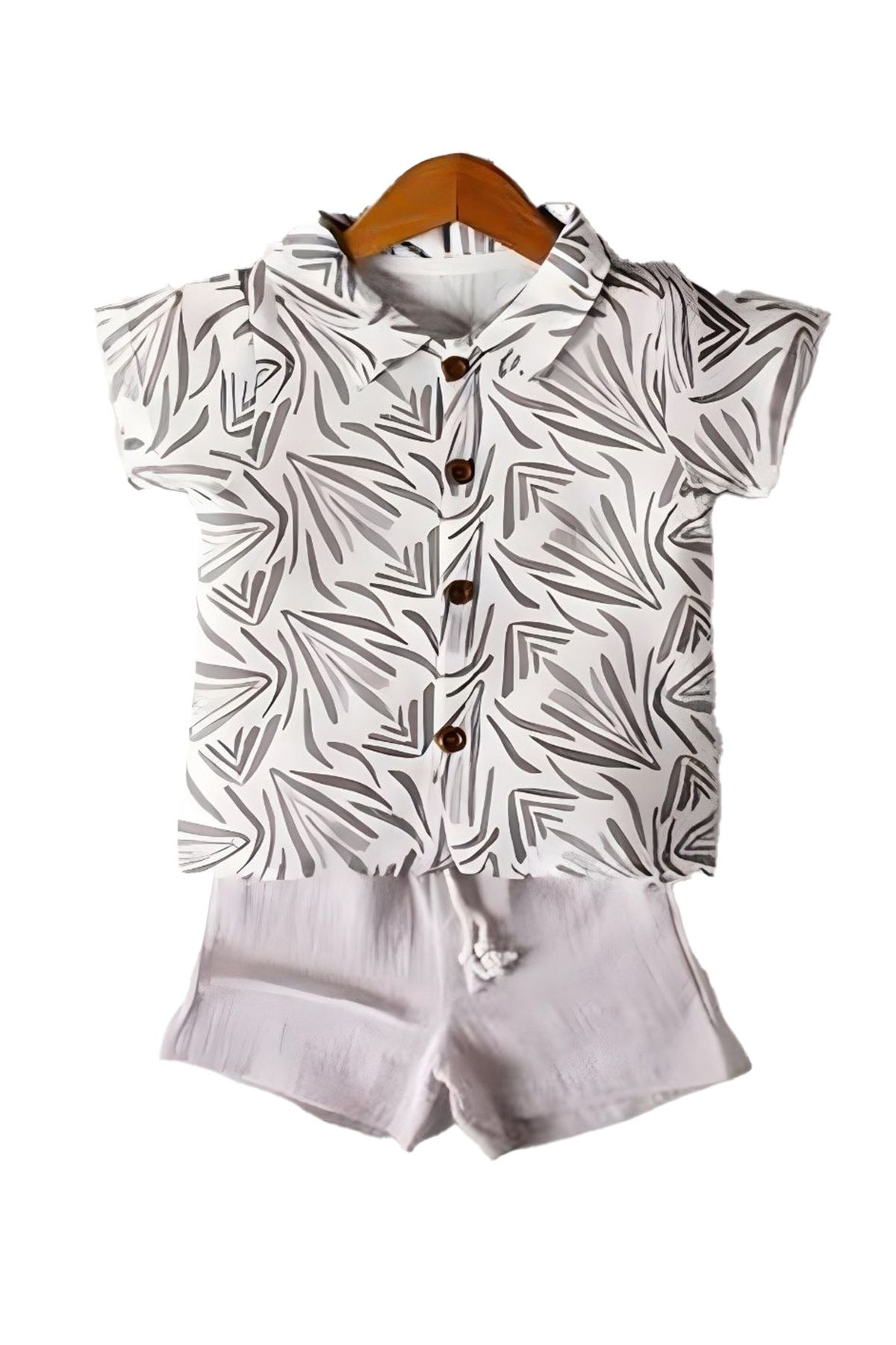 Modern ve şık tasarımıyla dikkat çeken bu takım, çocuğunuzun yaz günlerinde rahatça giyebileceği bir seçenek sunar. Yaprak baskılı kısa kollu düğmeli gömlek, serin tutarken şık bir görünüm sağlar. Elastik bel şort ise hareket özgürlüğü sağlayarak oyun oynarken rahatlık sunar. Hem günlük kullanım hem de özel günlerde tercih edilebilecek bu takım, çocuğunuzun gardırobuna ferah ve stil sahibi bir dokunuş katacak.