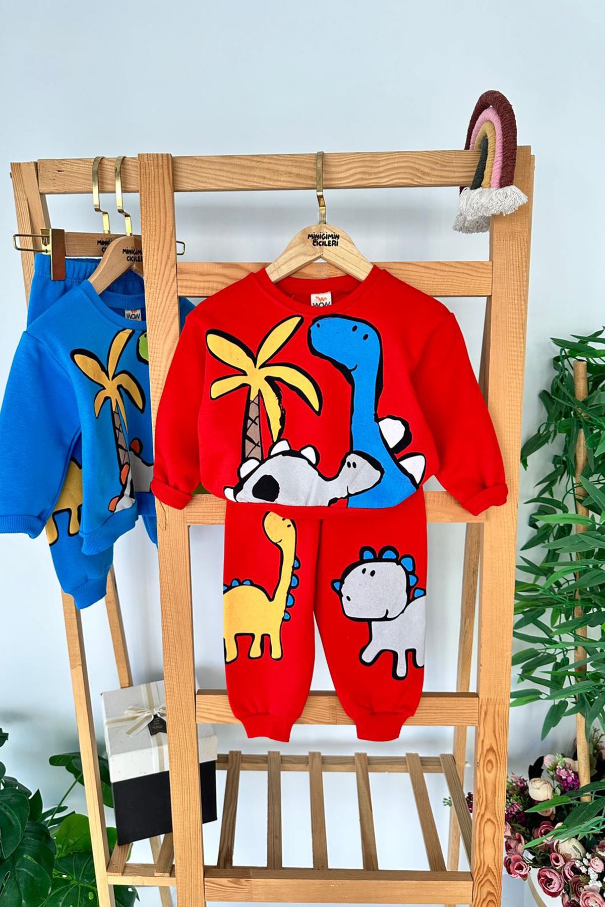 Miniğimin Cicileri Dino Baskılı Renkli Erkek Çocuk 2 li Kışlık Takım - Kırmızı