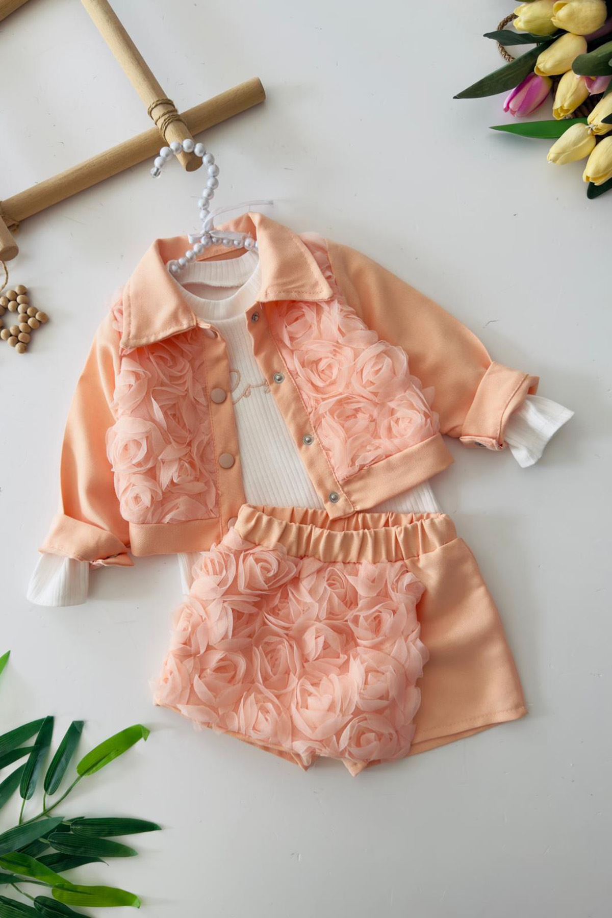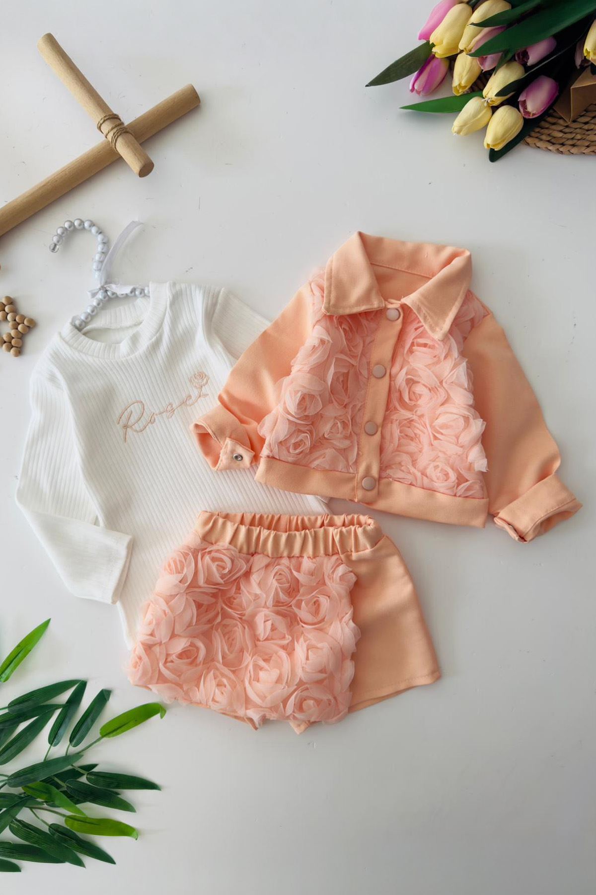 Miniğimin Cicileri Dokulu Gül Detaylı Kız Çocuk 3 lü Takım - Somon