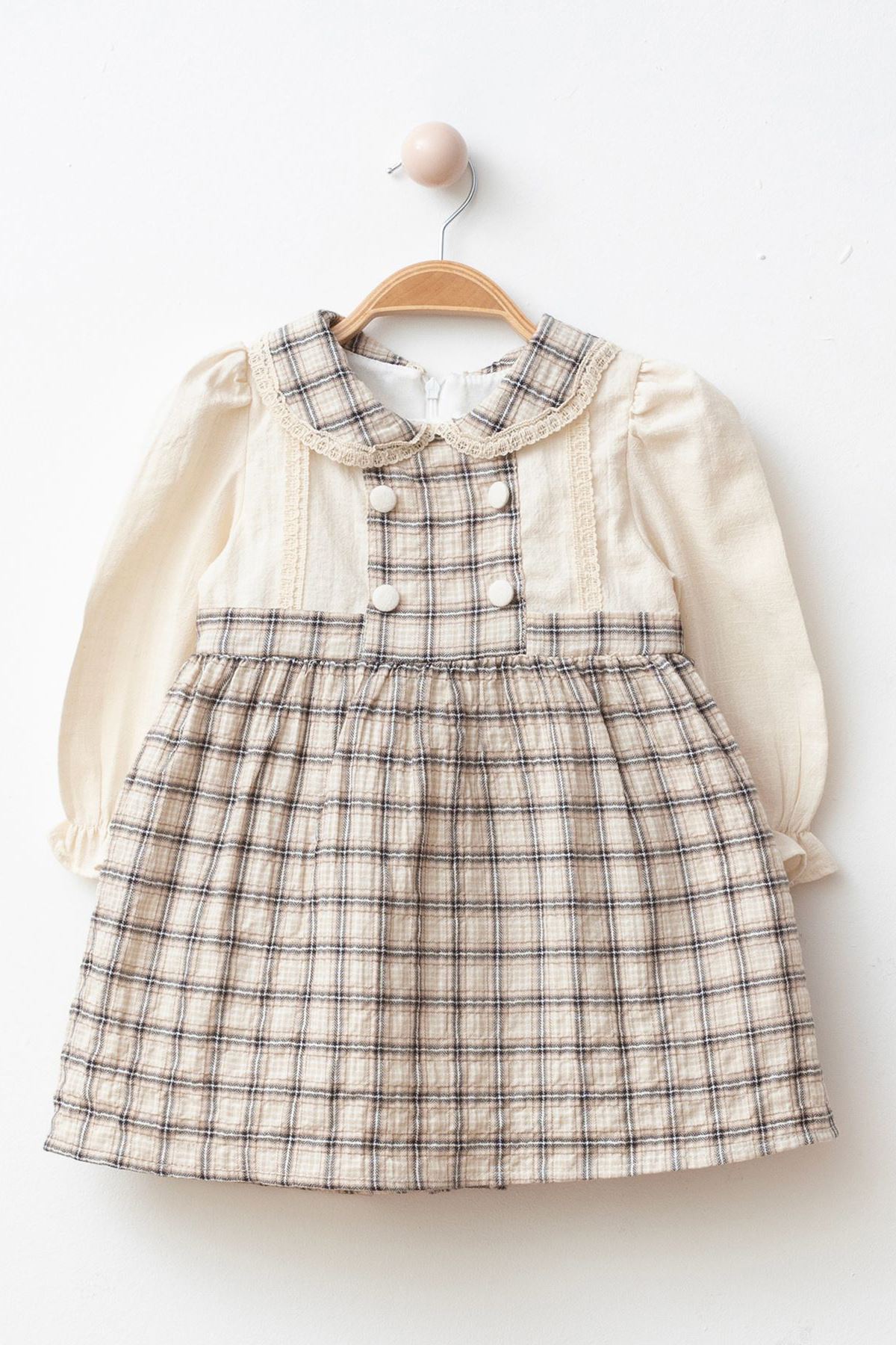🌸 Miniğimin Cicileri Ekose Düğme Detaylı Kız Çocuk Pamuk Elbise