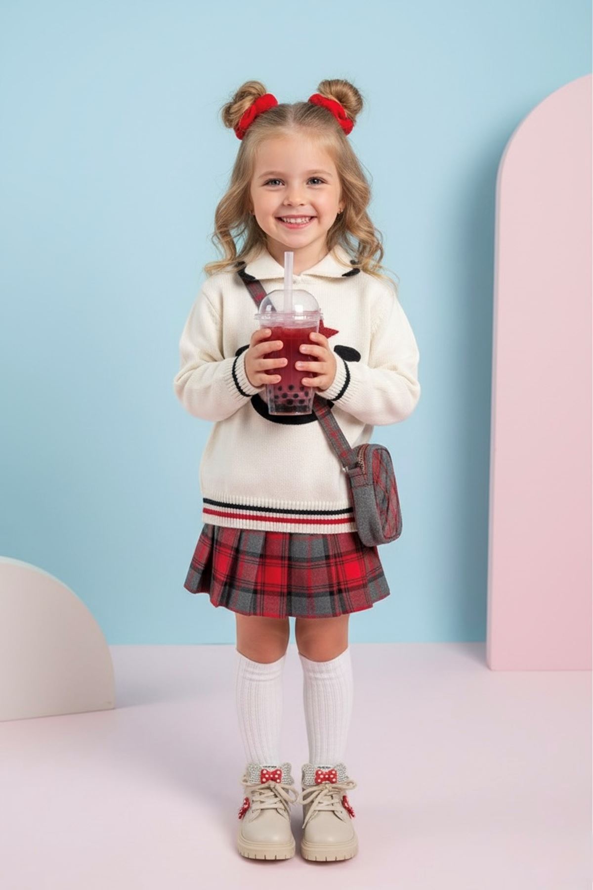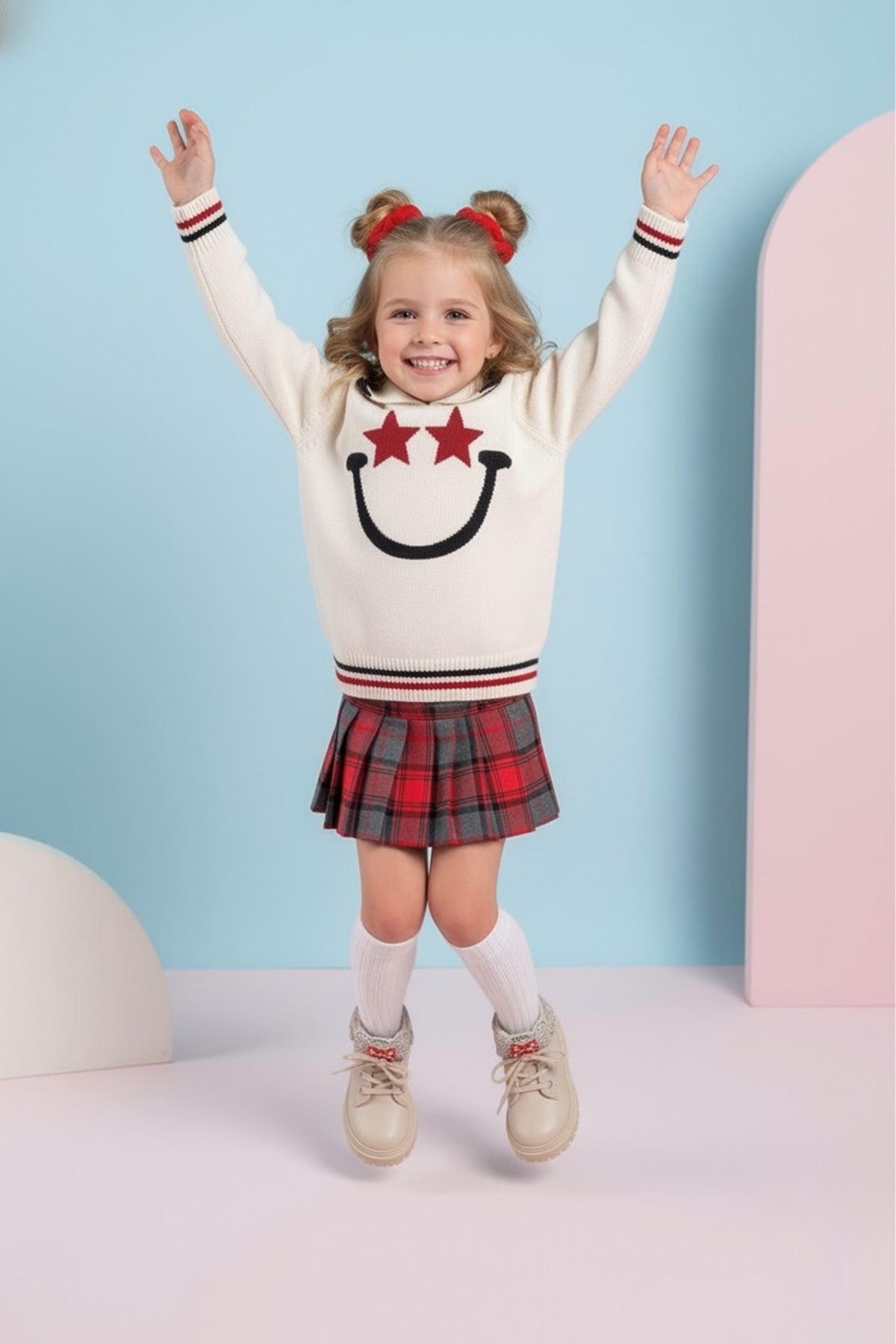 Ekose Şort Etekli Triko Yıldız İşleme Kız Çocuk 2'li Takım