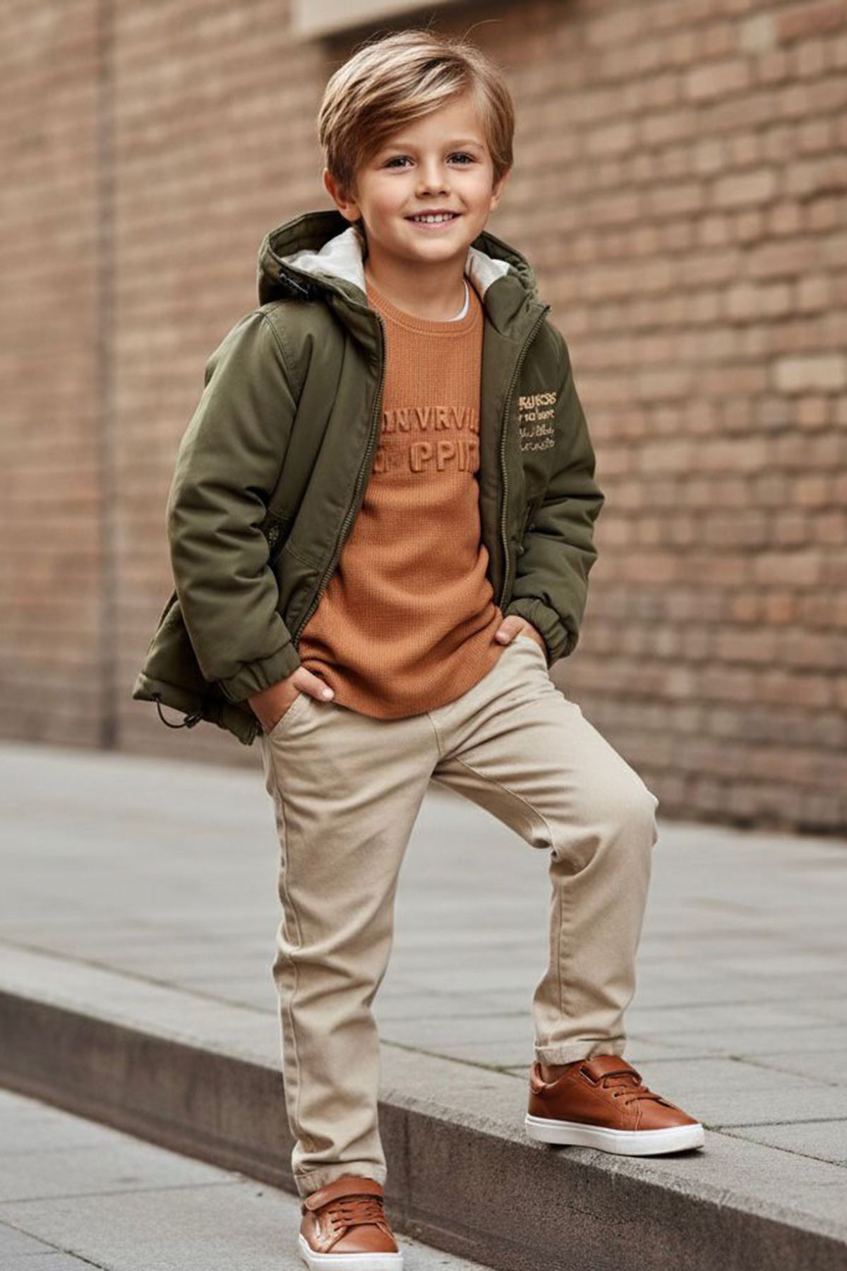 Soğuk kış günlerinde hem sıcak tutan hem de tarz bir görünüm sunan bu kombin, küçük beylerin gardırobunun favorisi olmaya aday! 🧡🍂