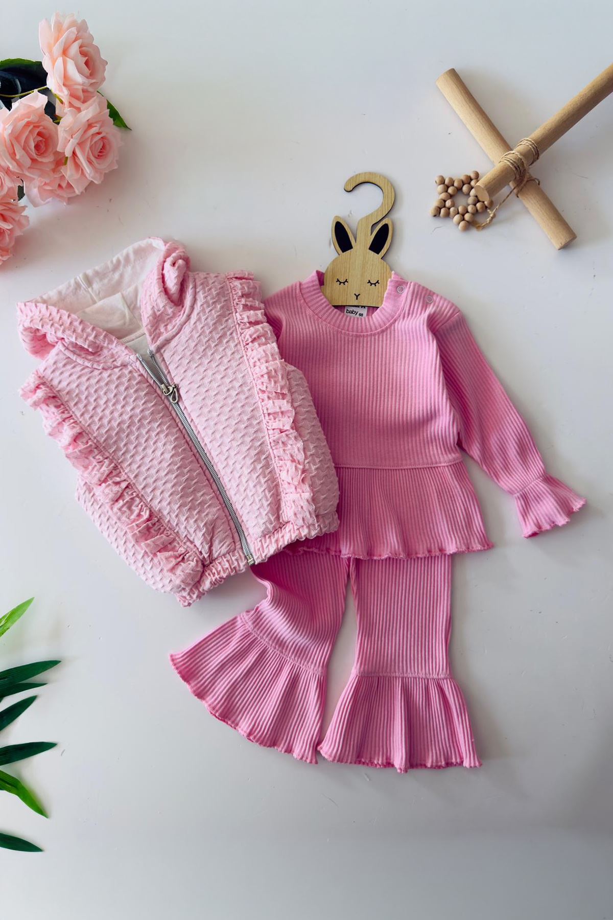 Miniğimin Cicileri Fırfır Detaylı Kapişonlu Simli Yelekli Kız Çocuk 3 lü Takım - Pembe