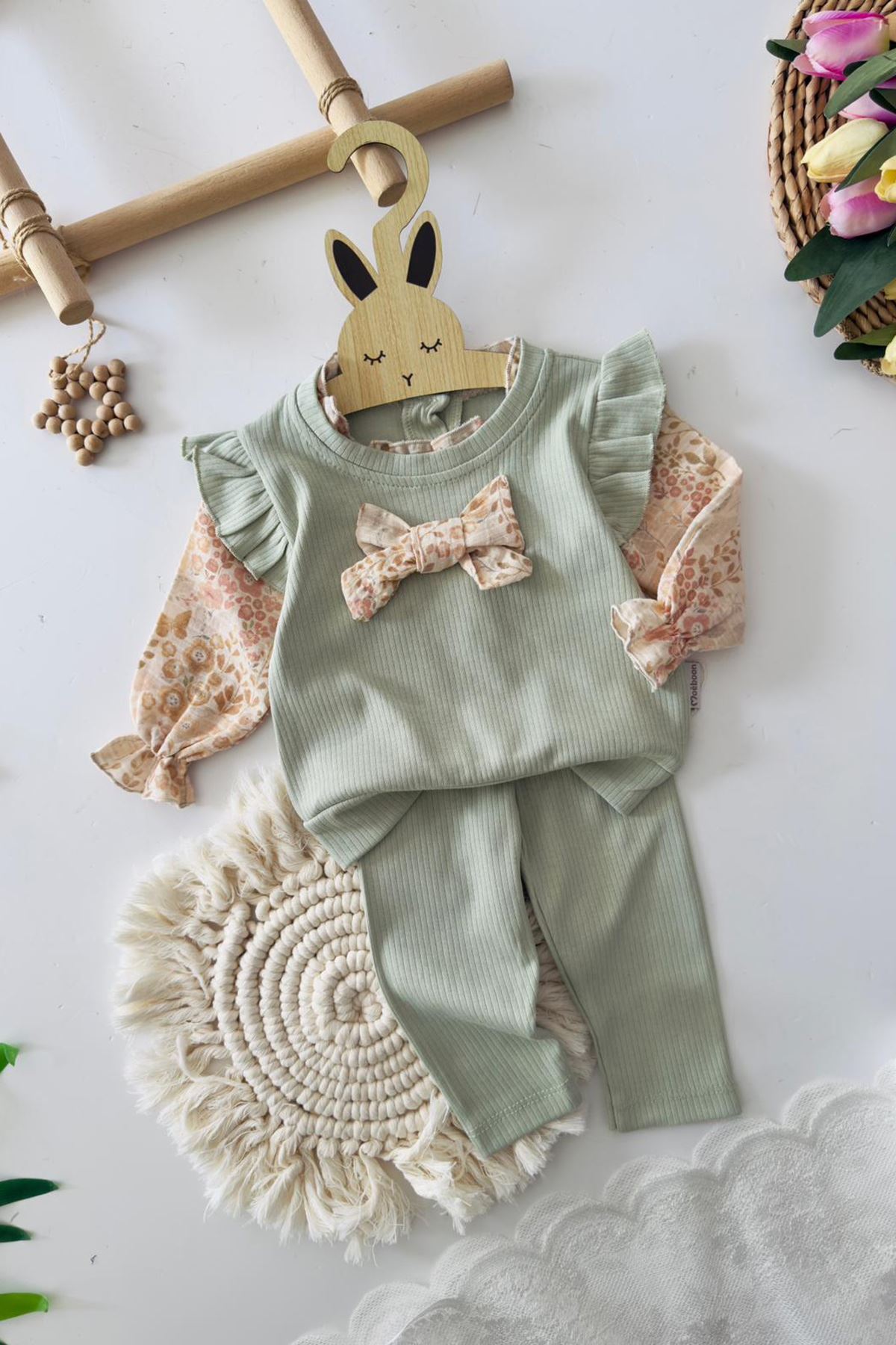 Miniğimin Cicileri Fiyonk Detaylı Çiçek Desenli Bluzlu 3 lü Kız Takımı - Yeşil