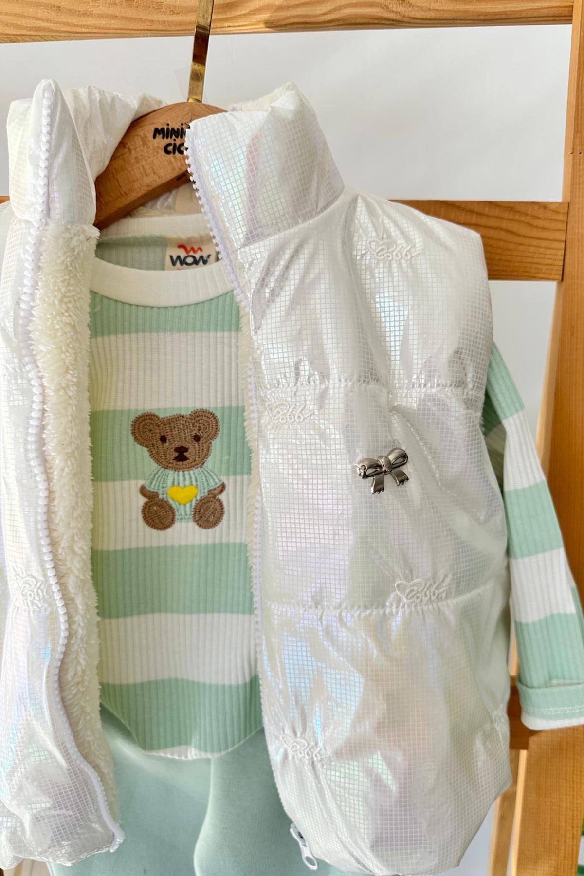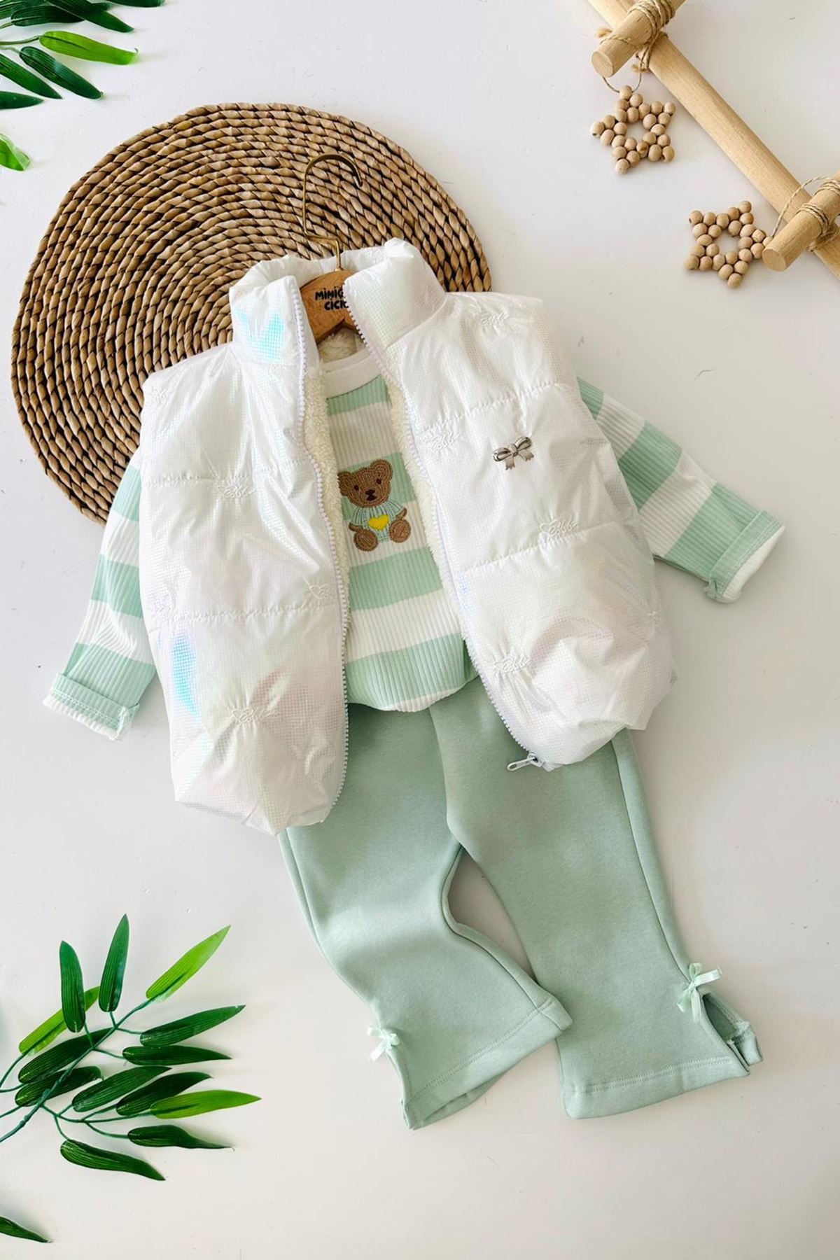 Miniğimin Cicileri Fiyonk Detaylı Şişme Yelekli Ayıcık Desenli Kız Bebek  3 lü Takım- Yesil