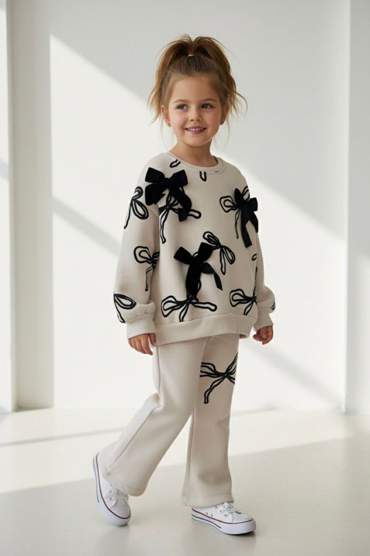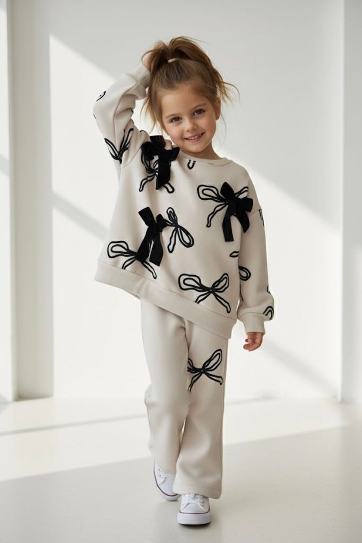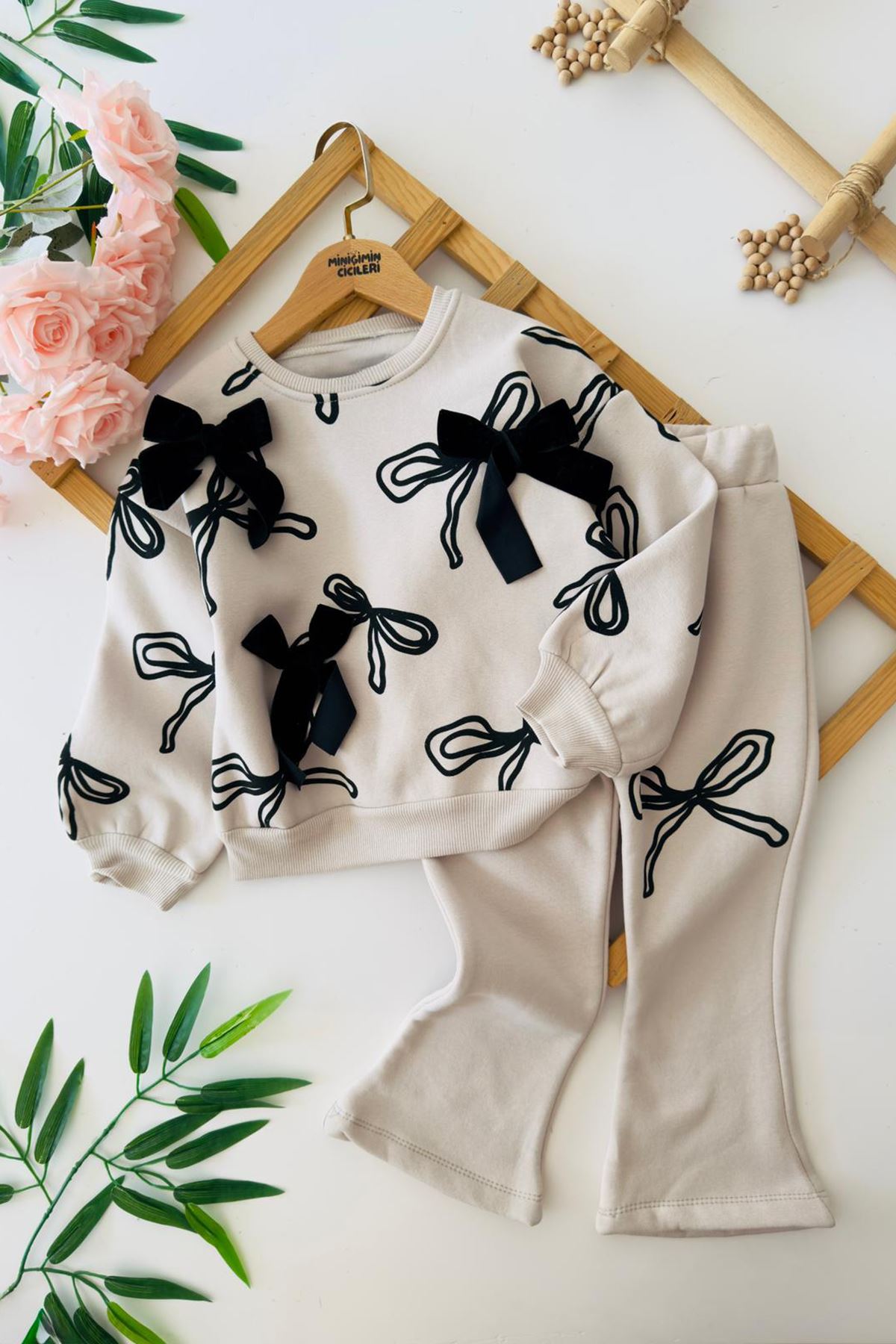 Tatlı fiyonk detaylarıyla minik stil ikonlarına özel şık ve rahat bir takım!