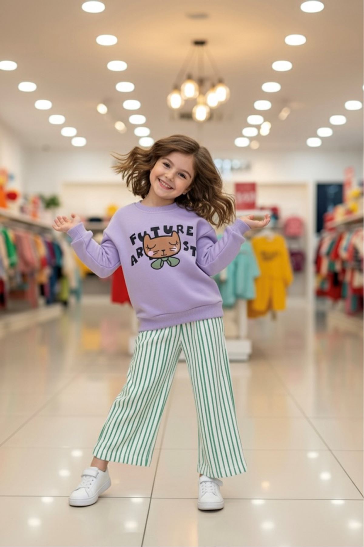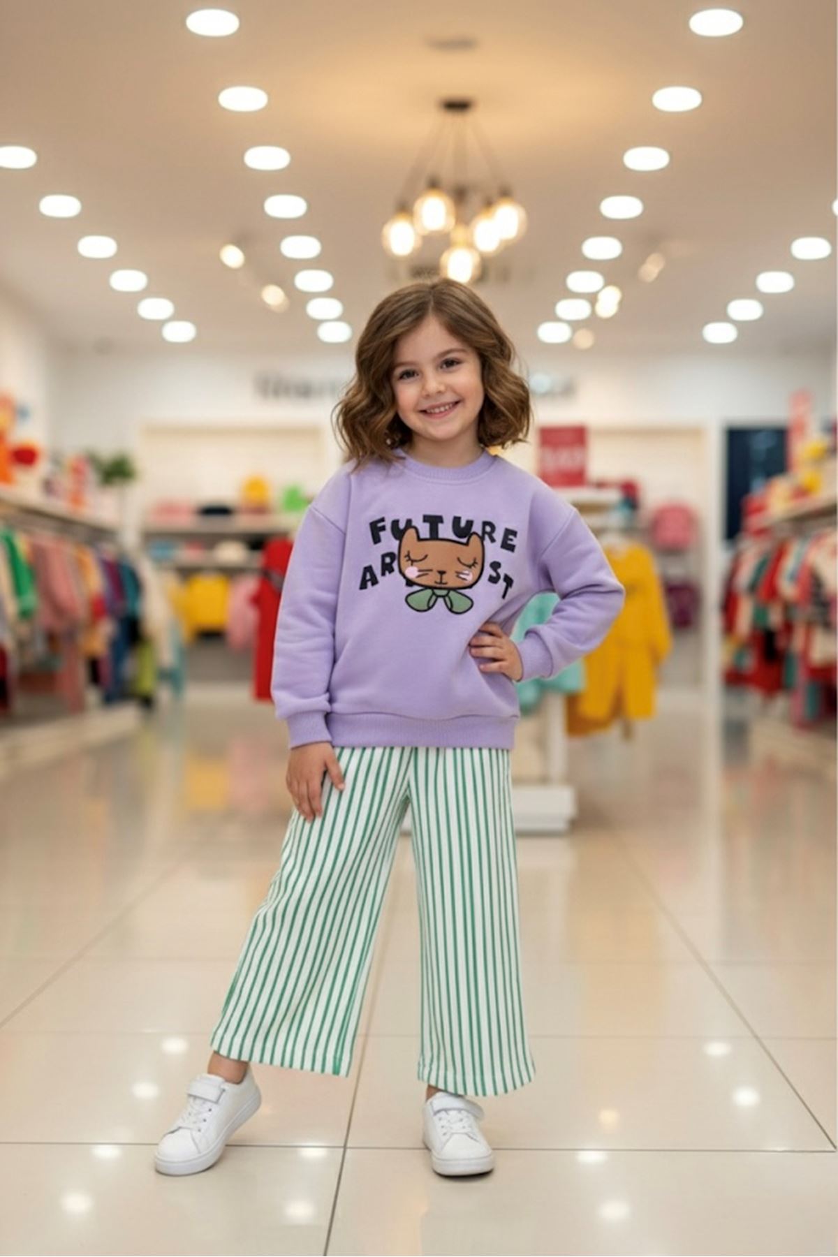 ✨ Ürün Özellikleri: ✔️ Üzerinde Future Artist yazılı tatlı baskı bulunan sweatshirt, modern ve eğlenceli bir görünüm sunar. ✔️ Yeşil çizgili bol kesim pantolon, konforlu ve trend bir duruş sağlar. ✔️ Yumuşak ve rahat kumaşı ile gün boyu konfor sunar. ✔️ Günlük kullanım, okul ve geziler için ideal kombin imkanı verir. ✔️ Hem şık hem sportif bir görünüm için kolayca farklı parçalarla kombinlenebilir.