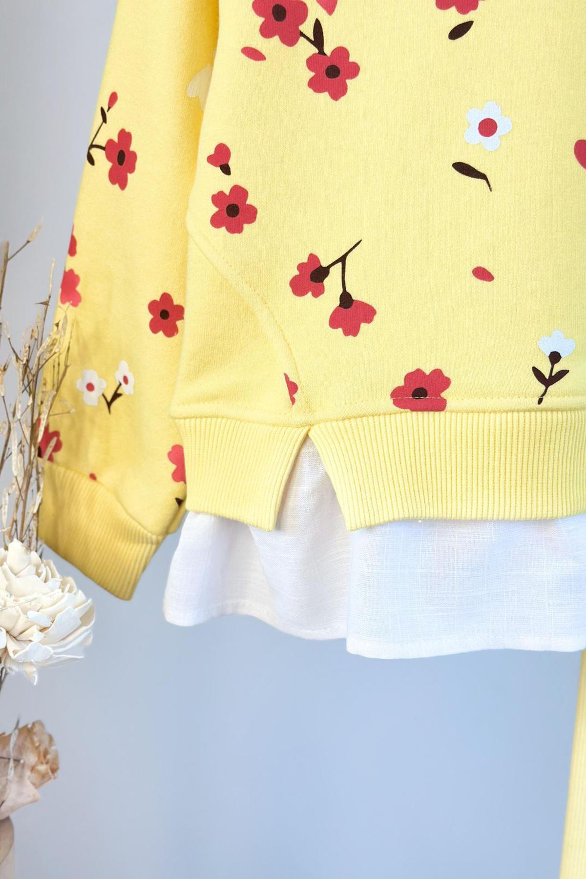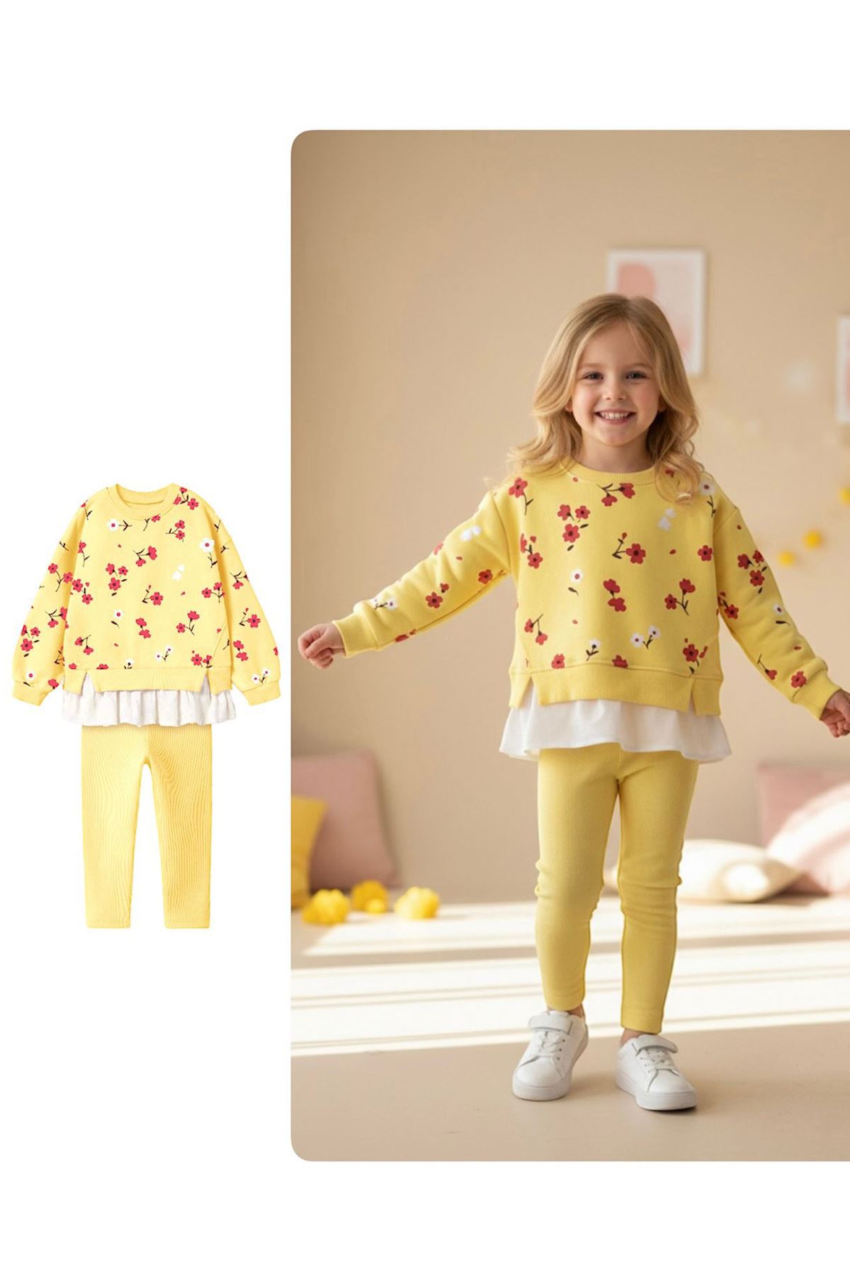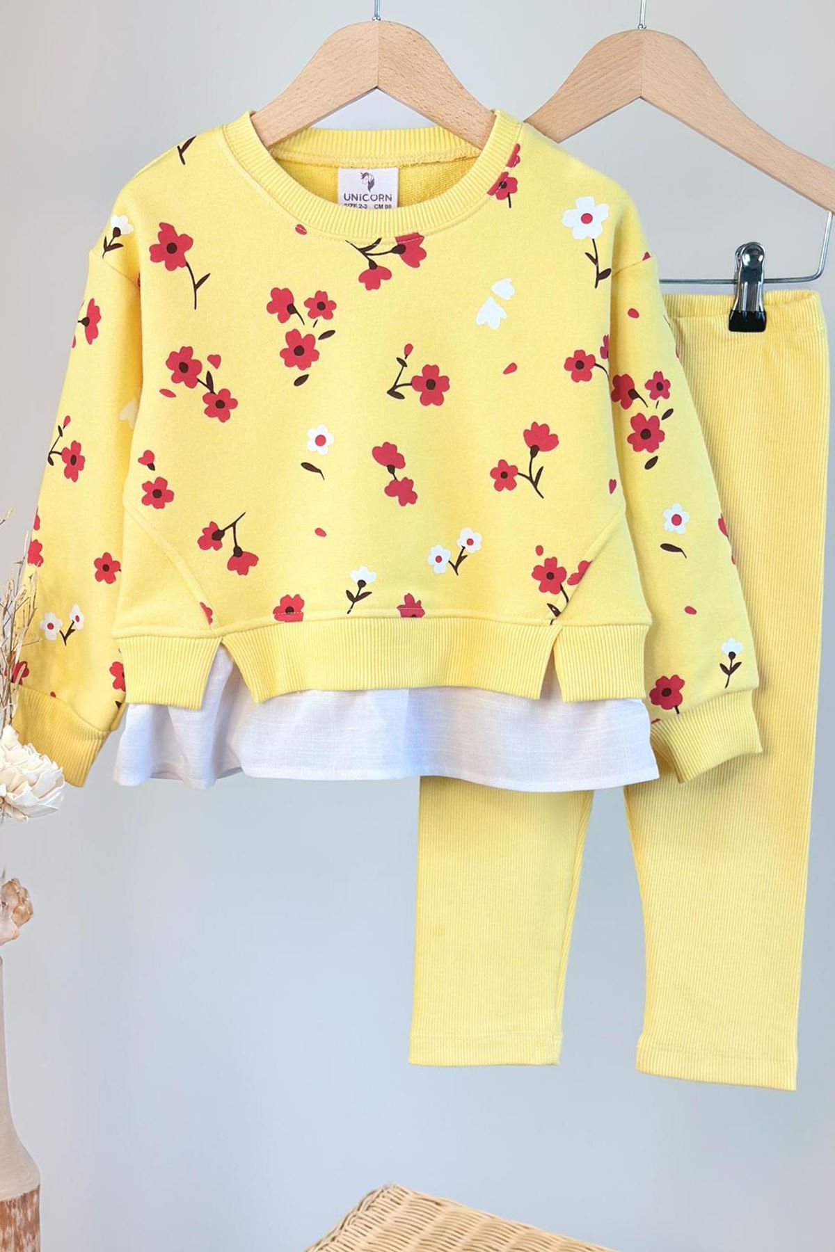 Neşeli renkler, zarif çiçek baskıları ve şık gömlek eteği detayıyla bu takım, kız çocuklarının enerjisini yansıtır. Hem günlük kullanımda hem de özel günlerde tercih edilebilecek bu model, hareket özgürlüğü ve konfor sunar.