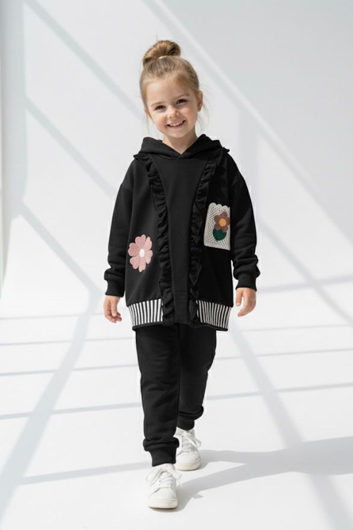 🔹 Ürün Özellikleri: – Örgü aplikeli papatya ve cep detayları – Yumuşak ve konforlu 2 ip şardonsuz mevsimlik kumaş – Fırfır detaylı fermuarlı kapüşonlu üst – Esnek bel yapısına sahip rahat alt eşofman – Bahar ve serin yaz günleri için ideal