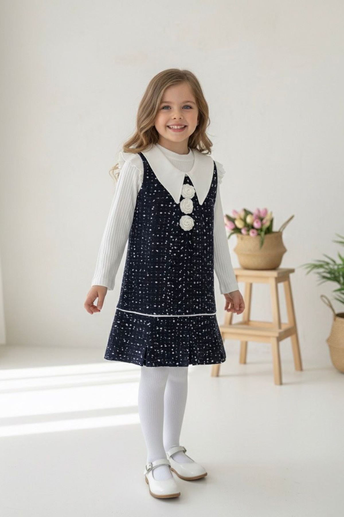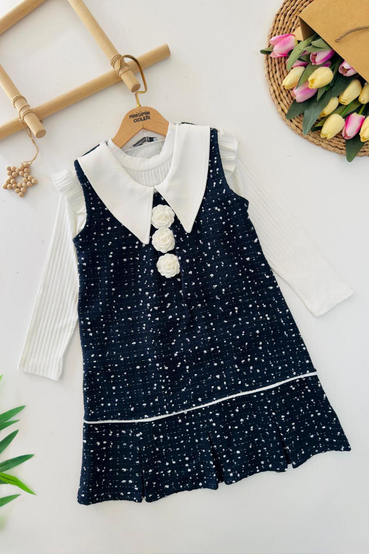 Miniğimin Cicileri Gül Detaylı Tüvit Elbise ve Badi Kız Takım - Lacivert