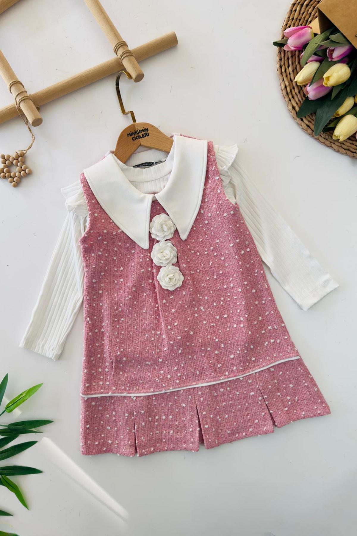 Miniğimin Cicileri Gül Detaylı Tüvit Elbise ve Badi Kız Takım - Pembe