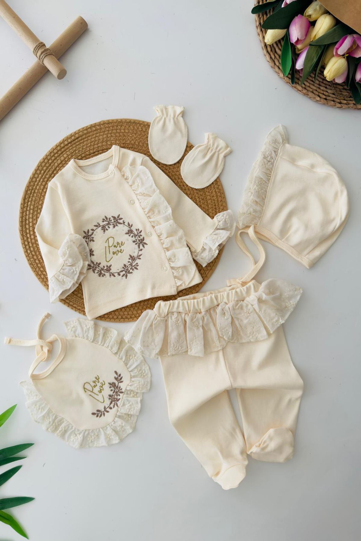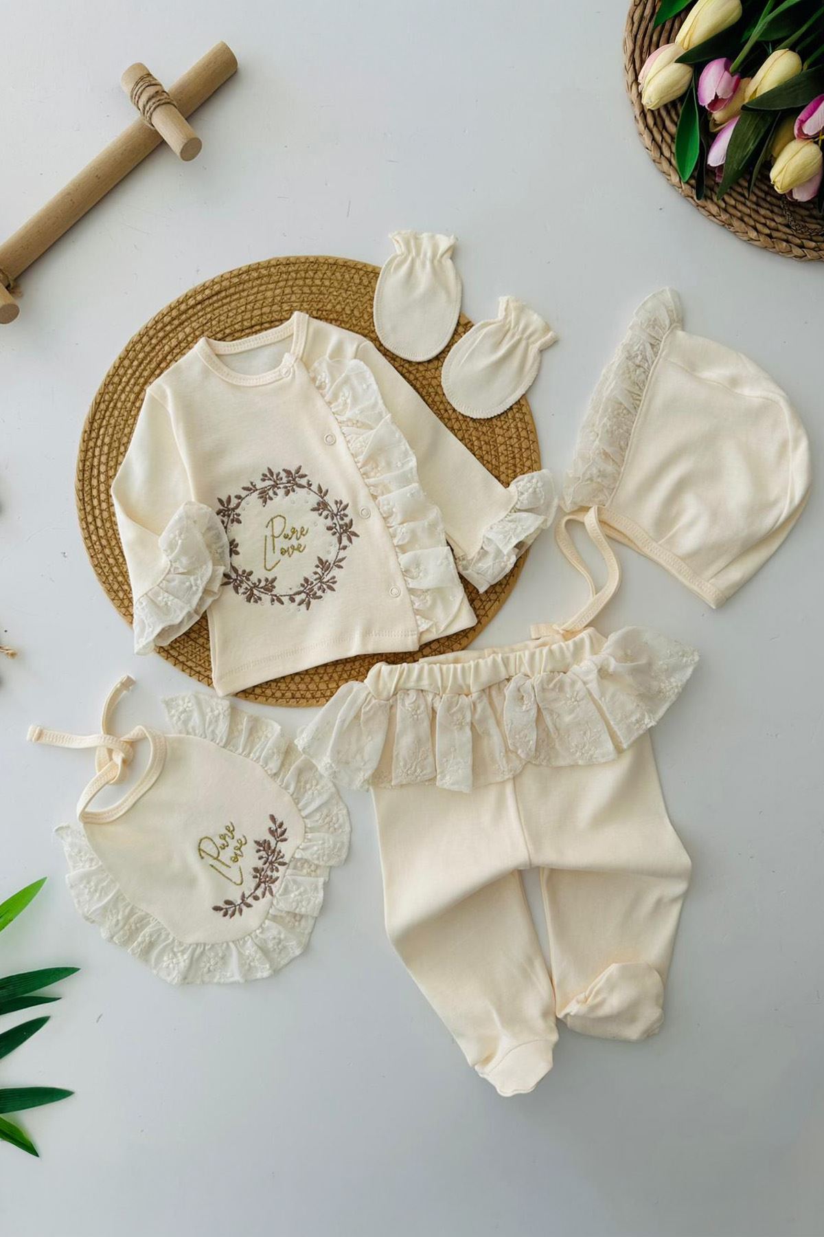 🌸 Miniğimin Cicileri Güpür Detaylı İşlemeli Kız Bebe 5'li Hastane Çıkışı Set