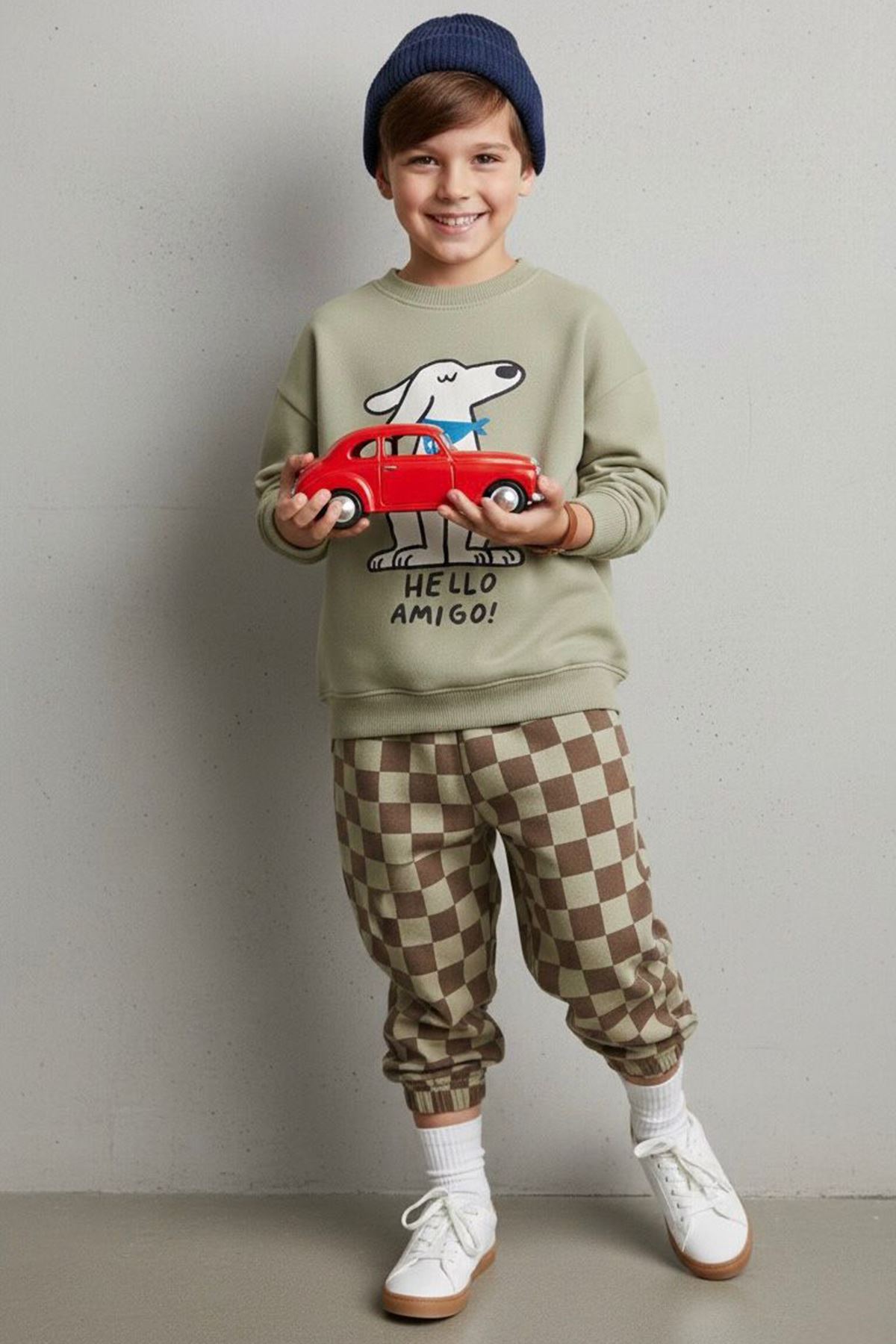 🐶 Miniğimin Cicileri Hello Amigo Köpek Baskılı Dama Detaylı Erkek Çocuk Takım
