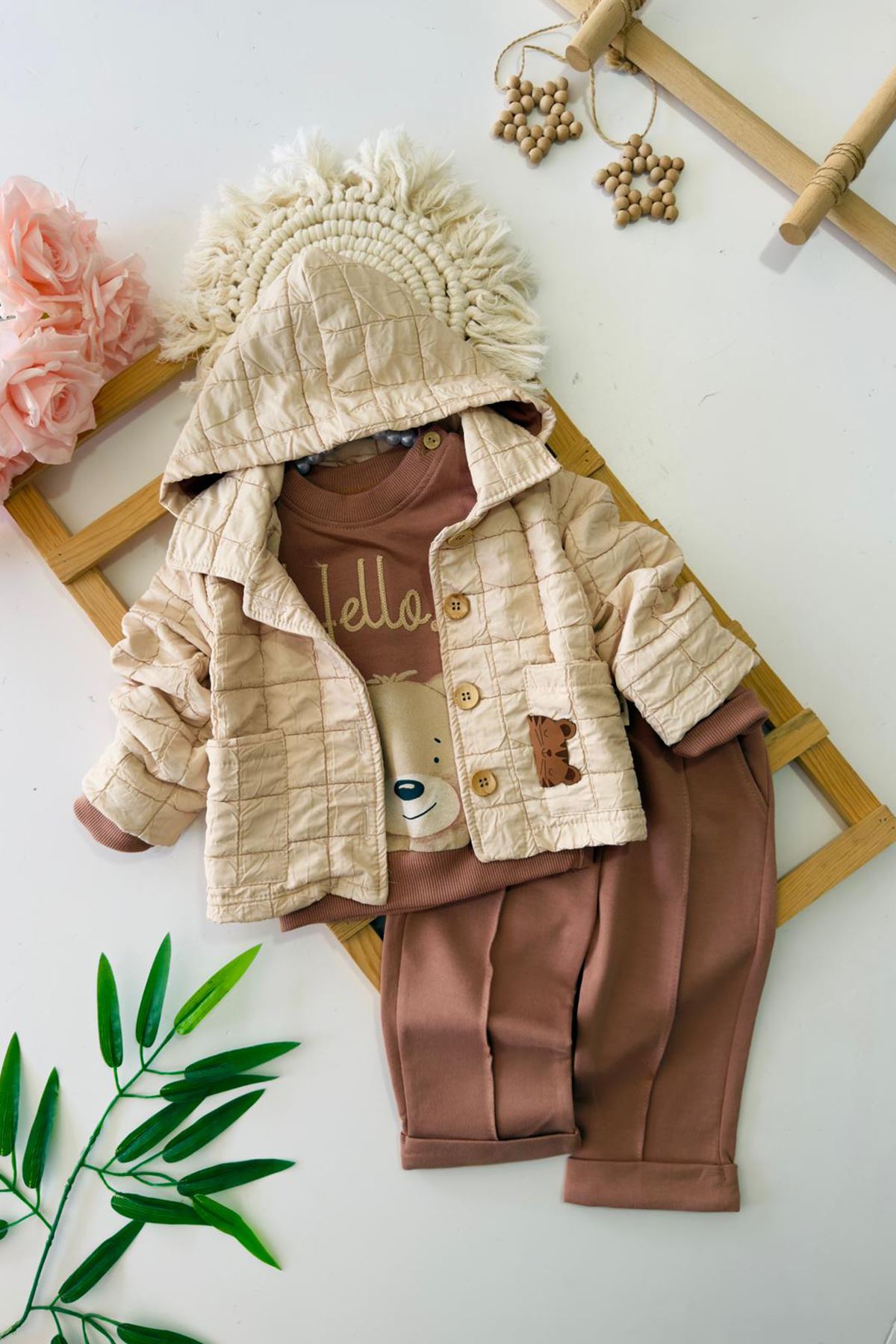 🌸 Miniğimin Cicileri Hello Ayıcık Desenli Kapitoneli Erkek Bebek 3’lü Takım