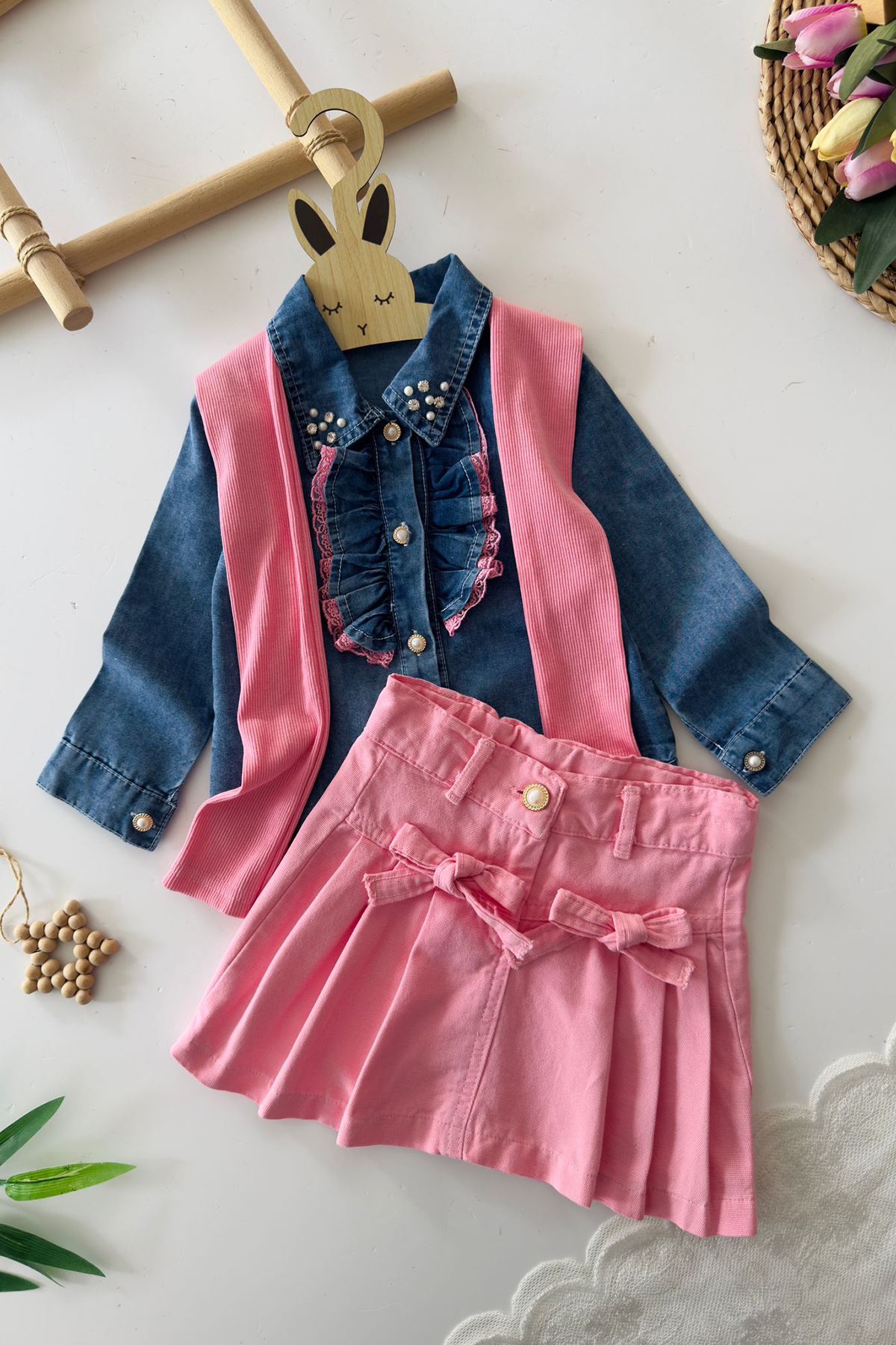 Miniğimin Cicileri İnci Detaylı Kot Gömlek ve Pileli Etek 3 lü Kız Takımı - Pembe