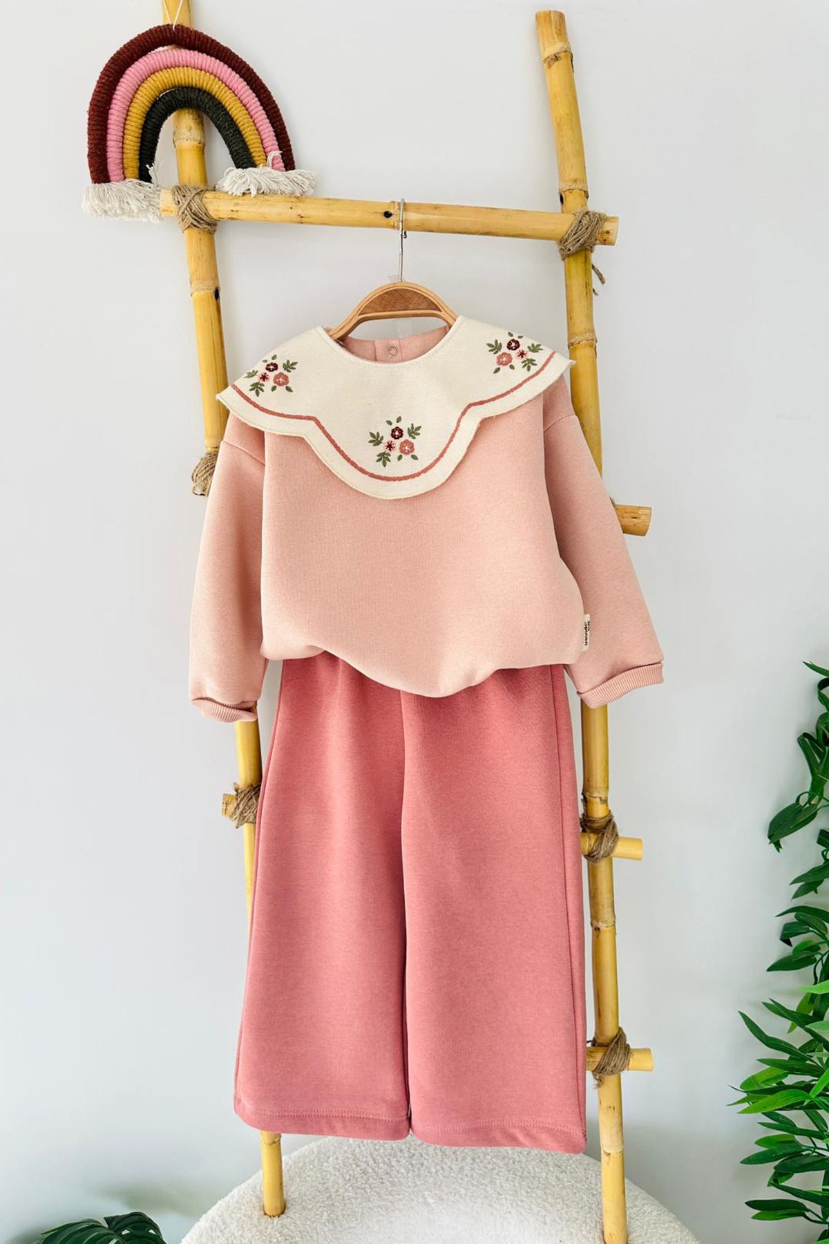 Miniğimin Cicileri İşleme Yaka Asimetrik Detaylı Kız Çocuk Kışlık Takım - Gül Kurusu