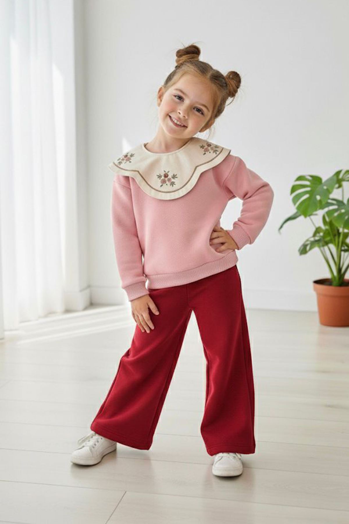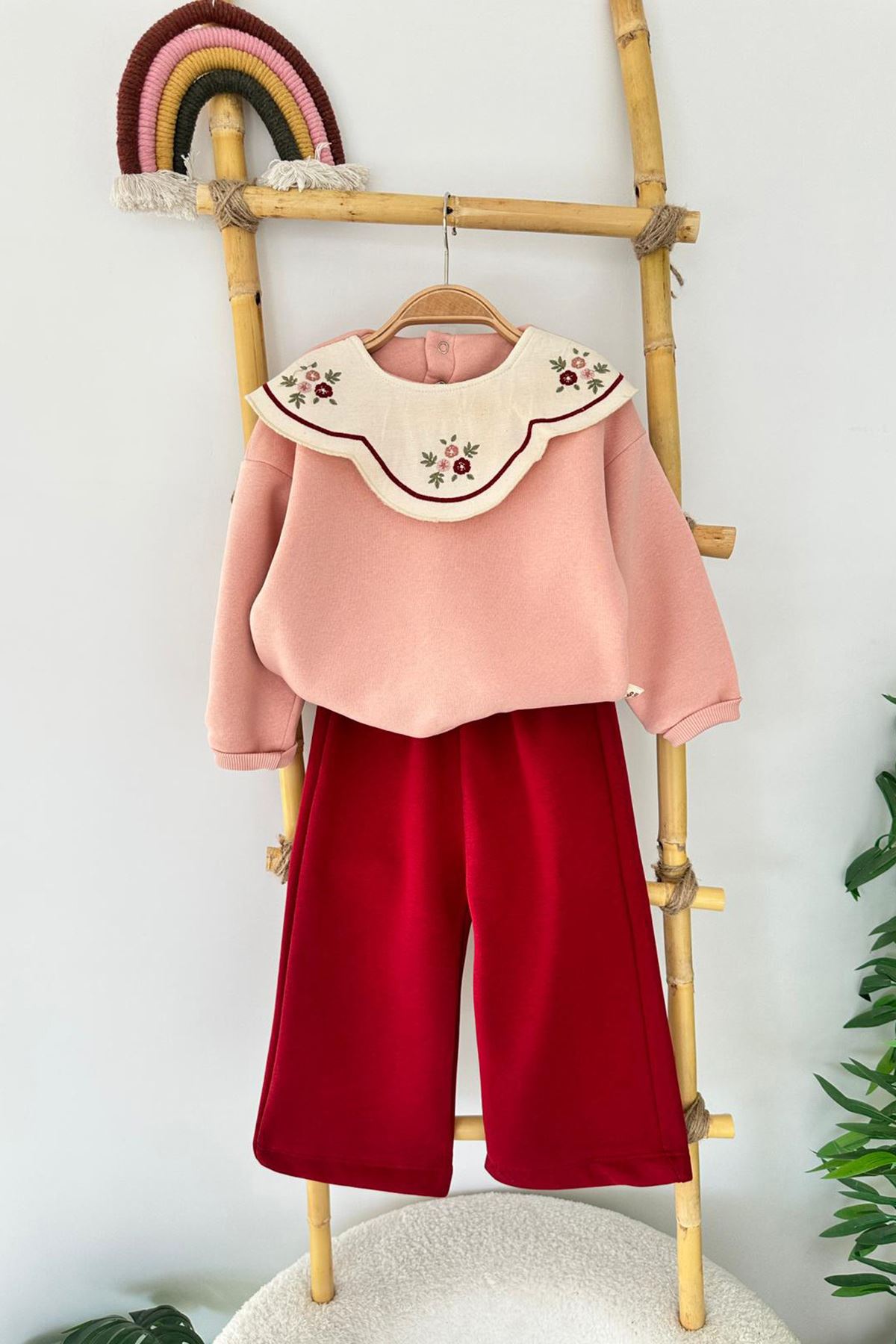 Miniğimin Cicileri İşleme Yaka Asimetrik Detaylı Kız Çocuk Kışlık Takım - Vişne