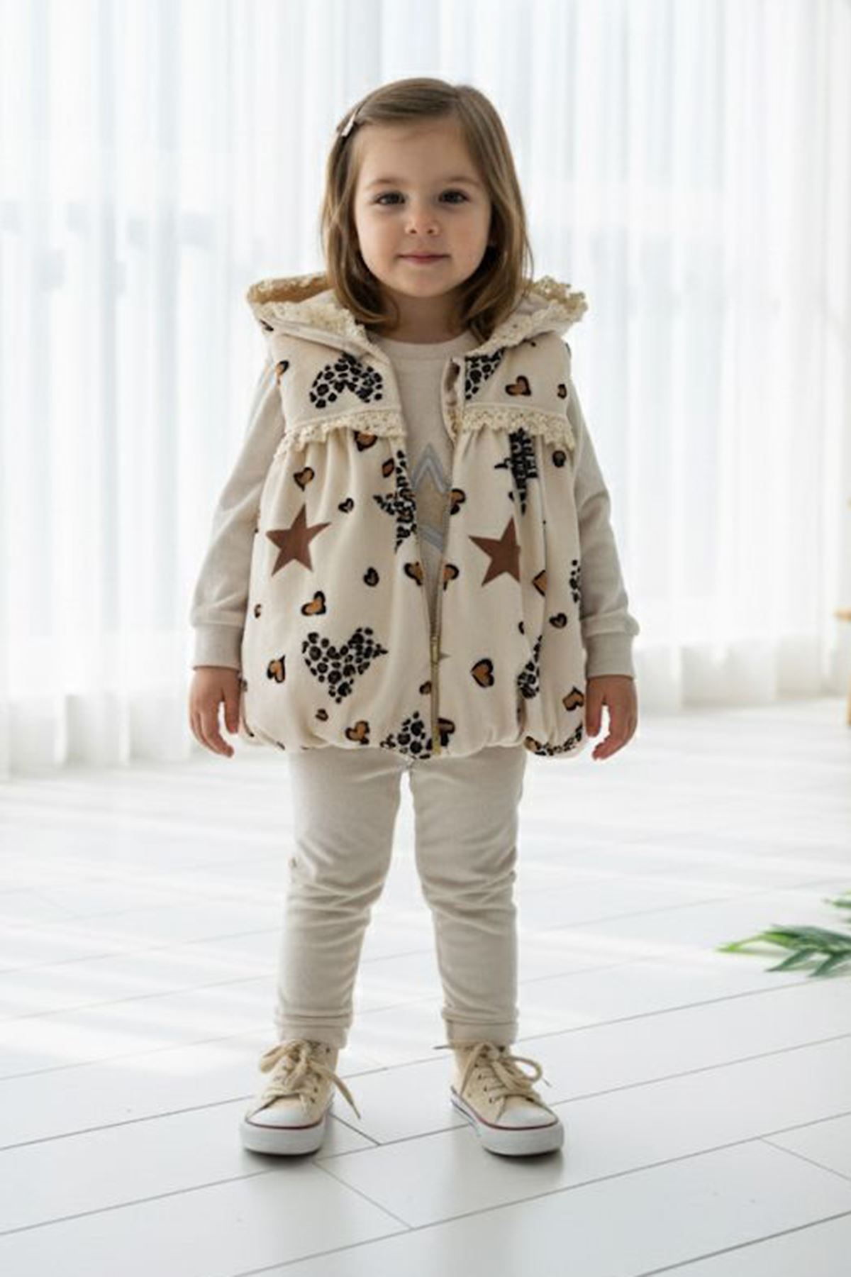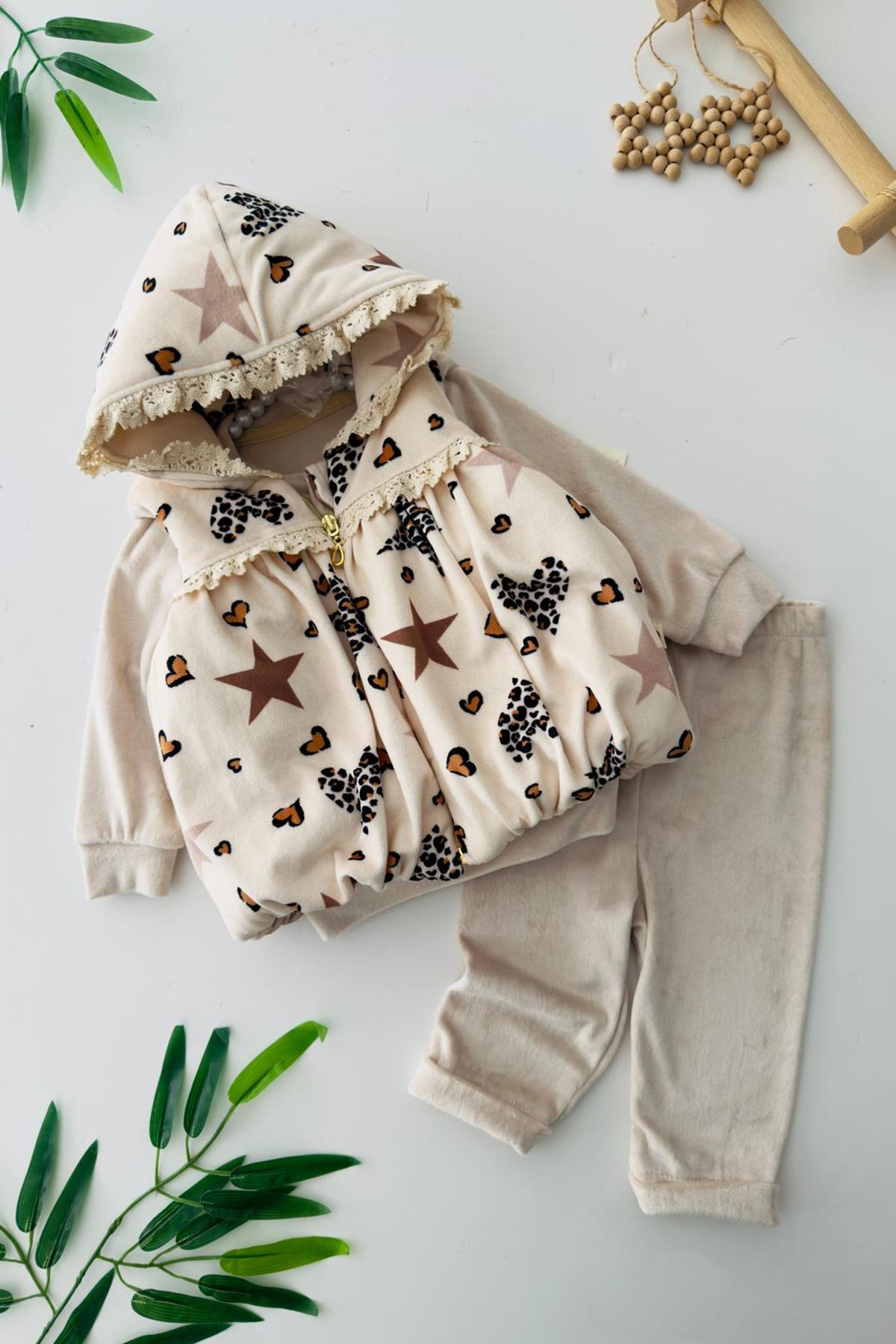 👶 Ürün İçeriği: 🧥 Kapüşonlu Kadife Yelek 👚 Kalp ve Yıldız Desenli Sweatshirt 👖 Kadife Pantolon
