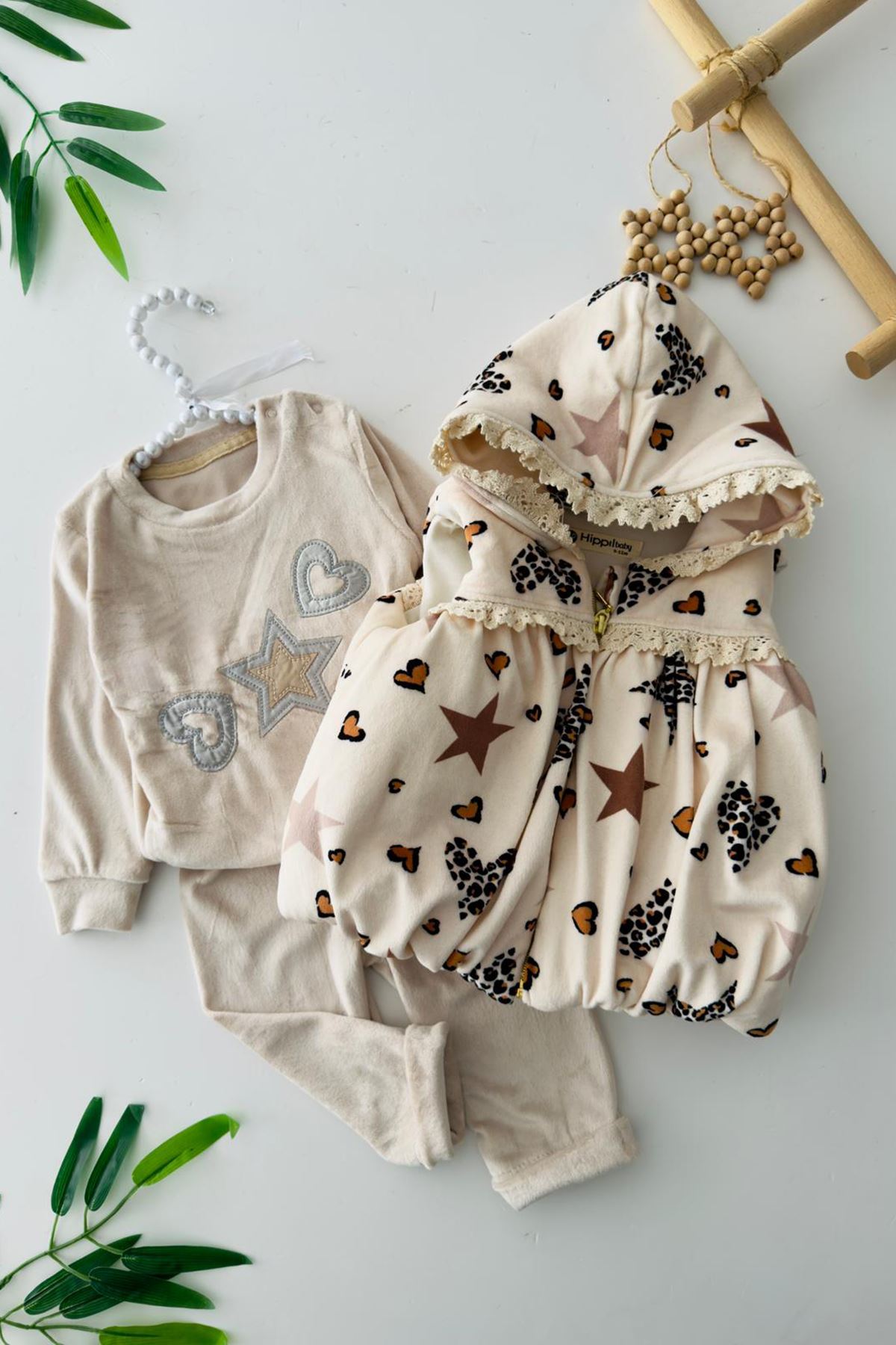 ⭐ Kadife Yelekli Yıldız Kalp Desenli Kız Bebek 3’lü Takım