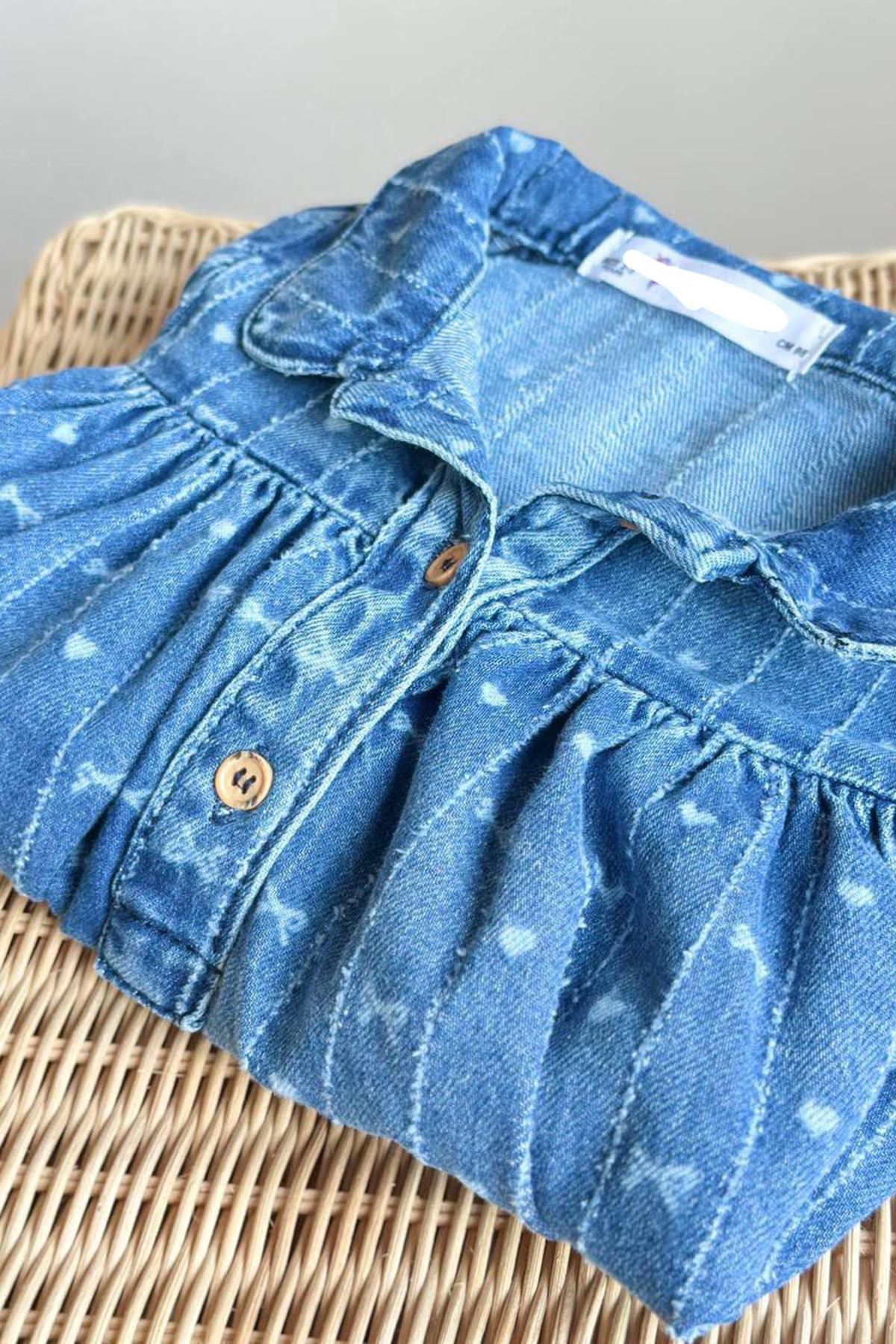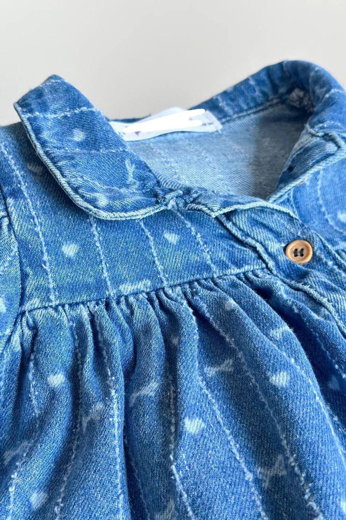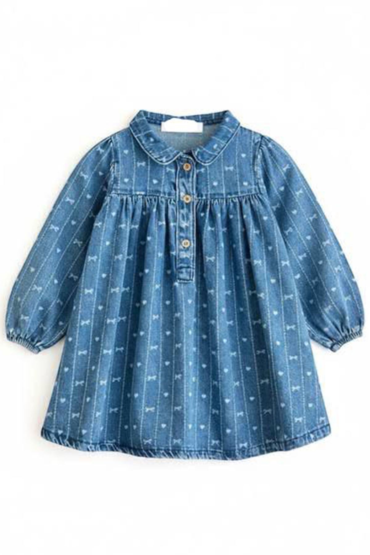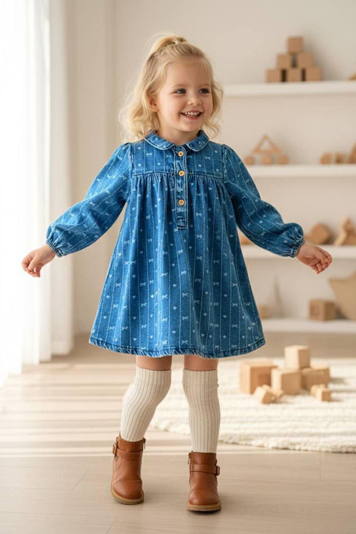 ✨ Ürün Özellikleri: 👗 Yumuşak dokulu soft kot kumaş ❤️ Tüm yüzeye yayılmış minik kalp ve fiyonk baskılar 🌼 Düğmeli ön kapama ve büzgülü etek kesimi 👧 Rahat kalıp, lastikli bilek detayları